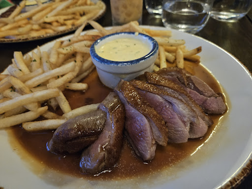 Let’s talk food: The Seared Duck Frites is a glorious, indulgent dish that’s all about comfort—juicy duck, citrusy jus, and those crispy shoestring fries with béarnaise sauce that’ll make you swoon. If you’re in the mood for something lighter but still packed with flavor, the Oven Roasted Wreckfish is your go-to. It’s paired with a smooth celery root puree, roasted squash, and local mushrooms that really showcase the best of Charleston’s local ingredients. And don’t miss the Charred Cabbage Schnitzel—it’s a flavor bomb with local mushrooms and spaetzle that’s just chef’s kiss.