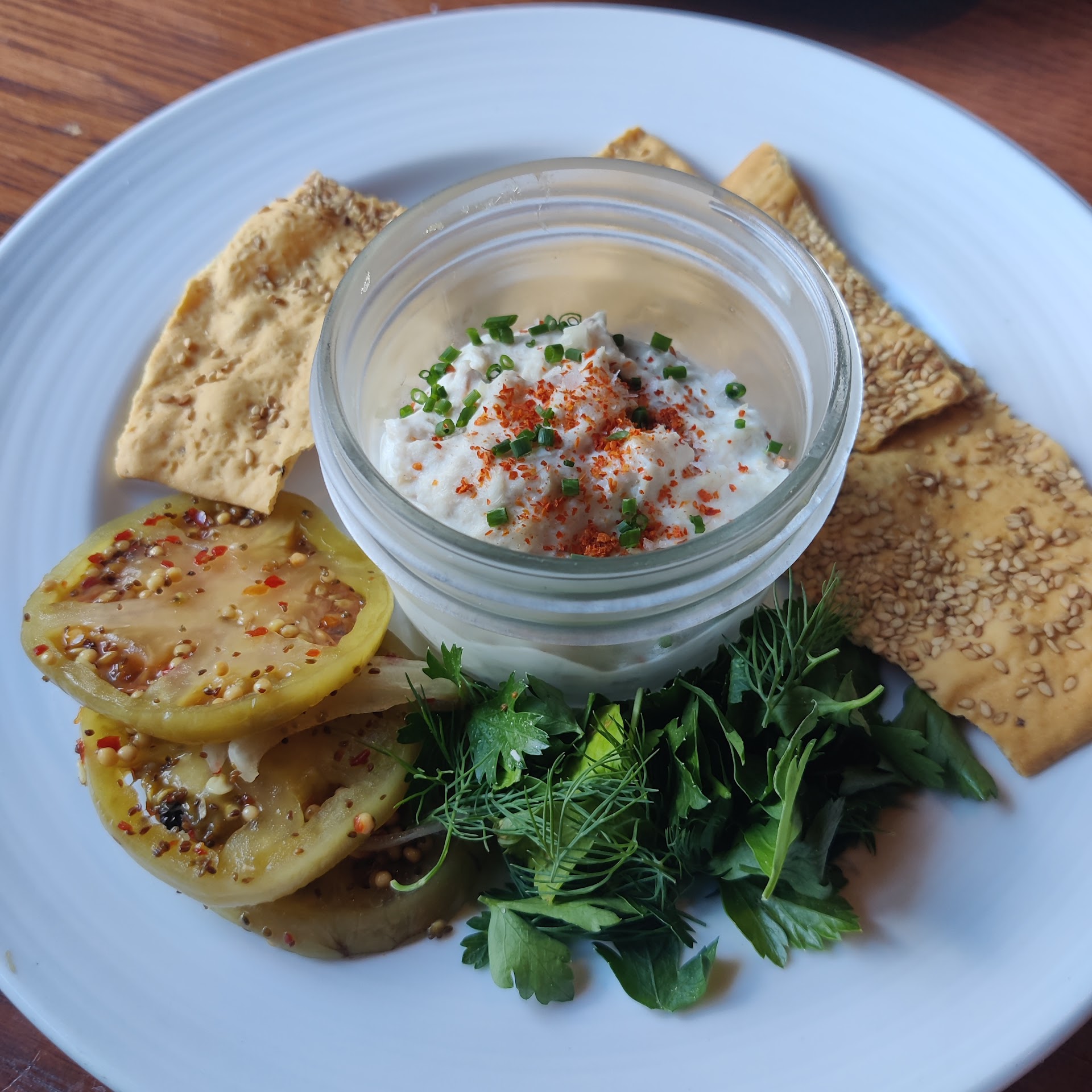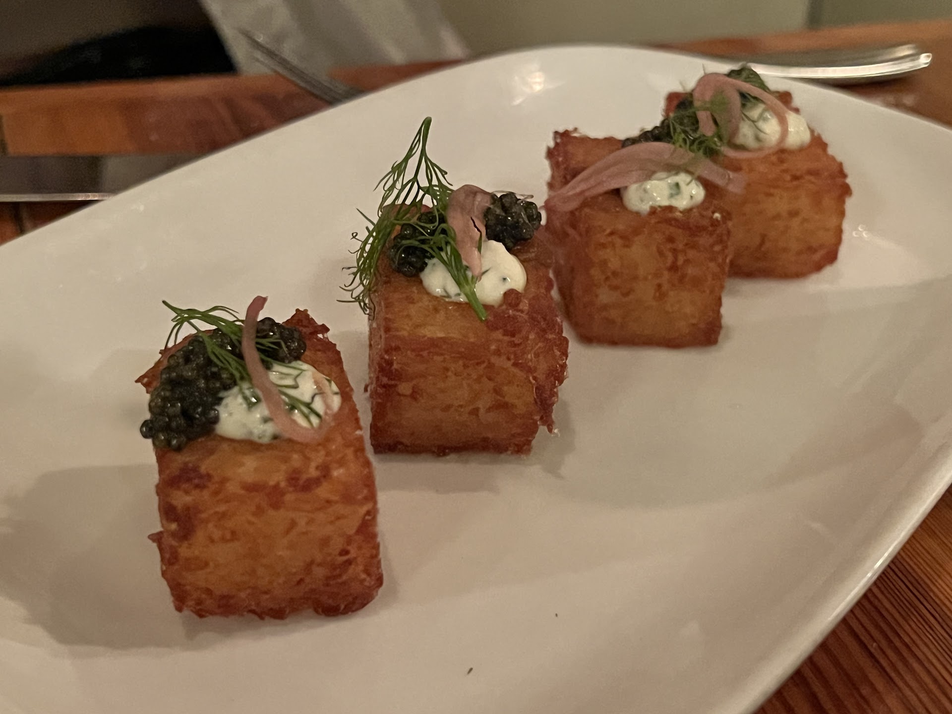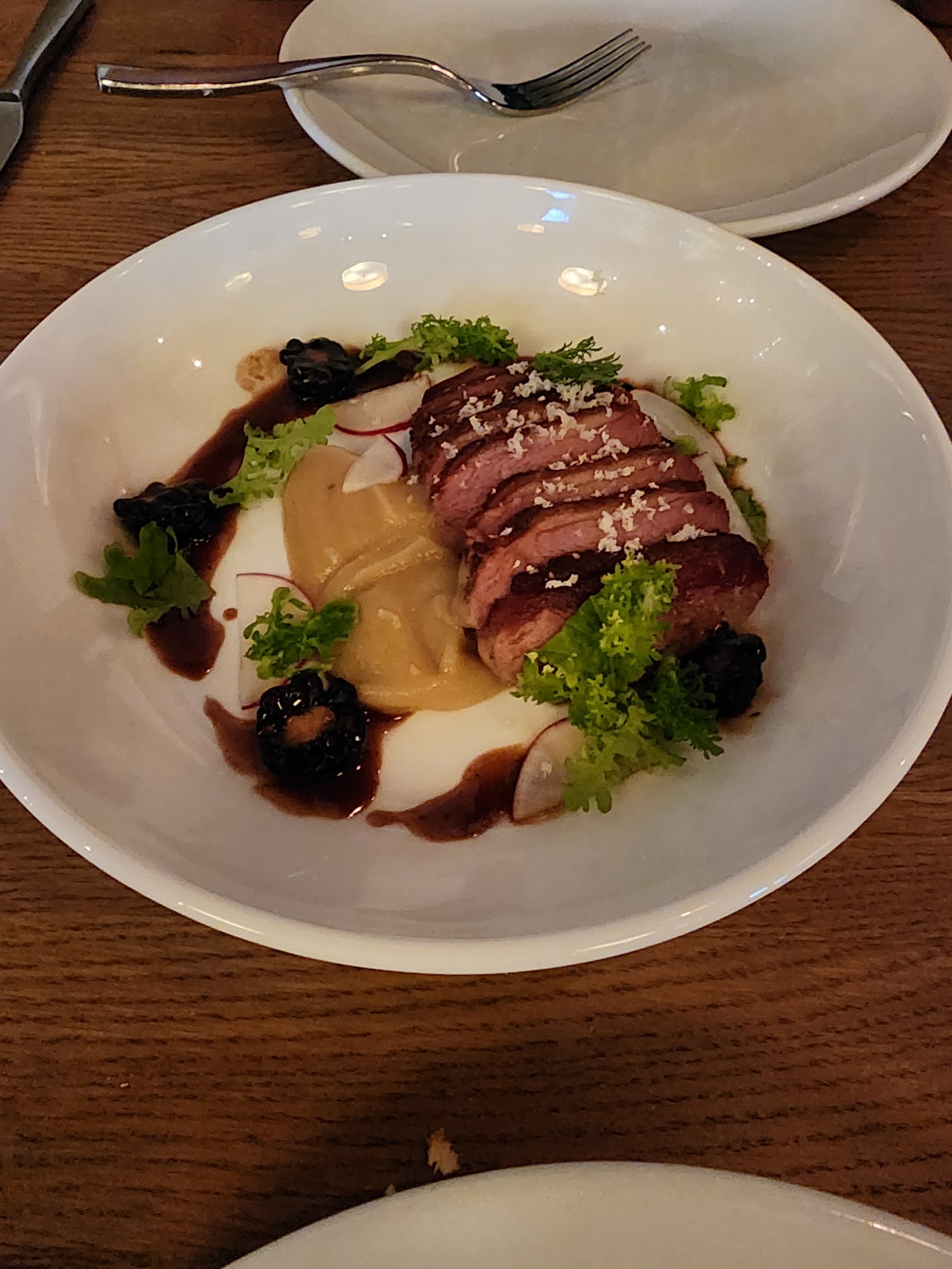 Starting with the positive: Our server, Rachel. She was a fantastic server, had a positive attitude, and really seemed to care about her work. The cocktails were reportedly great (I did not have one). The appetizers/shareables were great. We loved the Green Tomato Carpaccio, the Roasted Summer Squash, and Wood Roasted Peaches. One friend had the Eggplant Puttanesca and enjoyed it (flavorful and properly portioned).