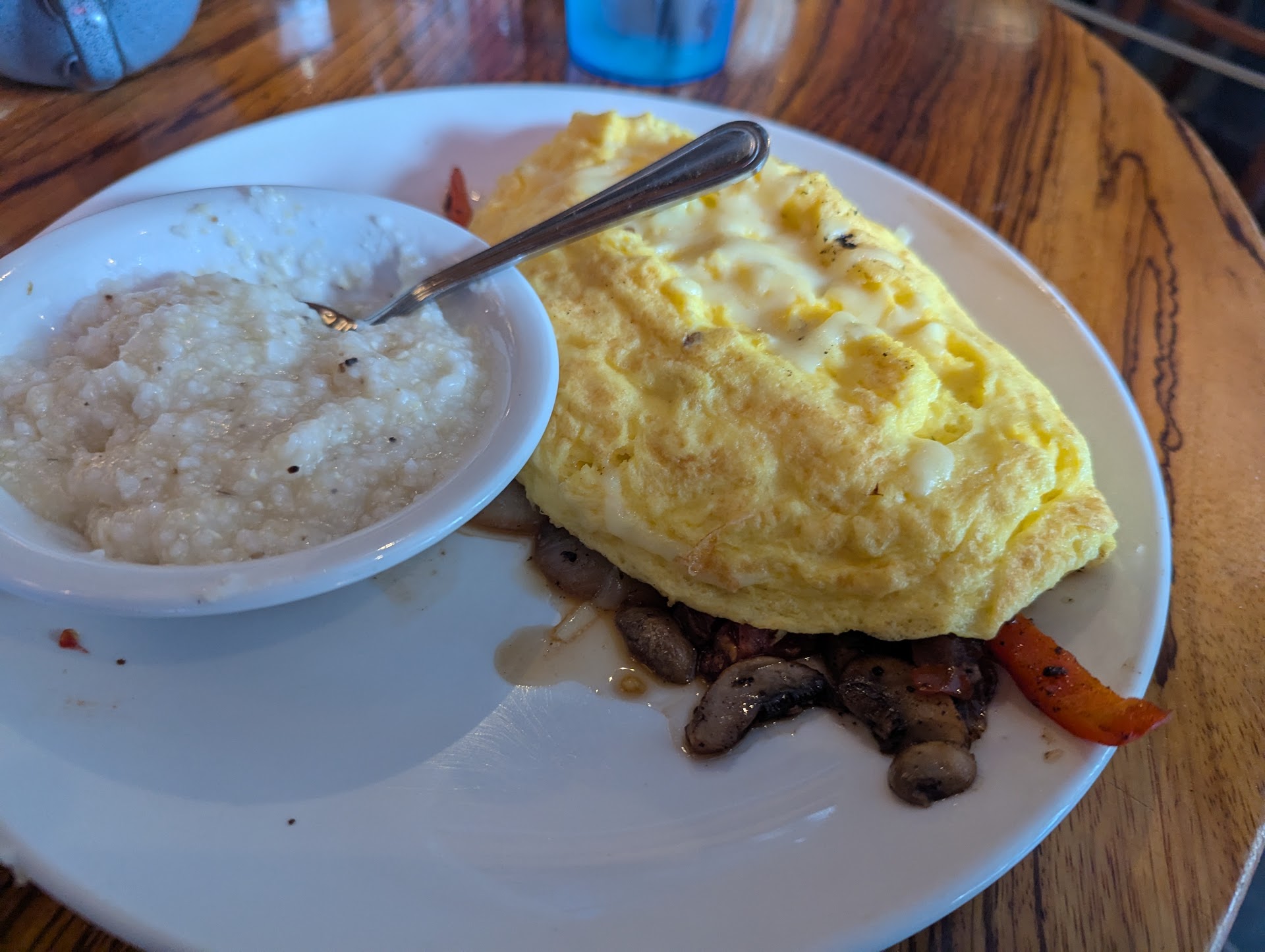 The food was good but the service was horrible. We went in and got sat quickly. They weren't super busy but finishing up the lunch rush. A hostess came by to check on us because we were sitting there so long with our menus. Our server finally came and we ordered a latte and a house coffee. Then ordered our food. He took 33 minutes to bring us our drinks, and never brought us water or anything. My coffee was cold and old. I flagged down the waiter and explained it was cold and he said it would take him 8 minutes to brew a new pot, that was "the last of the old pot". So what was he doing for 33 minutes? And was he not going to give me any refills?
