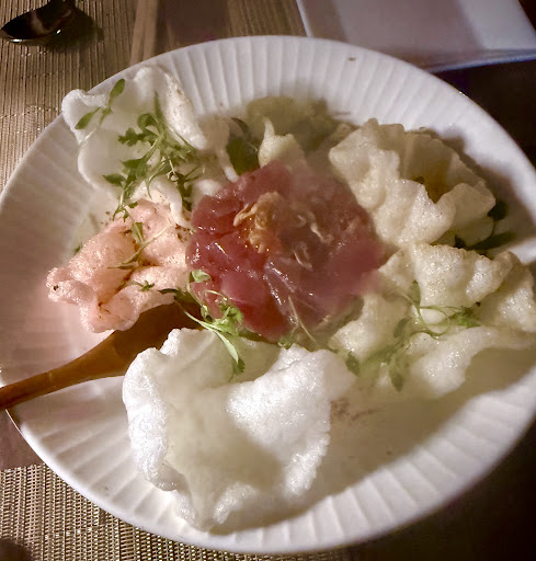 We did the chefs choice for the menu. We started with the tuna tartare and the beef fried rice. The tuna was good, although it could have used some acid to cut it. The shrimp crisps were tasty and the plating was beautiful. The beef fried rice was… not good. It wasn’t crispy, and it was DRY. The mains were the shaking beef and the chicken curry. The flavor of the dish was good, but I’m still not sure what the lettuce and tomato were for on the side of the plate and the meat was very tough. The curry was good, but very very salty. However, we didn’t get our curry til the beef was gone. Thankfully we share everything, but if we’d been eating separately that wouldn’t have been great.