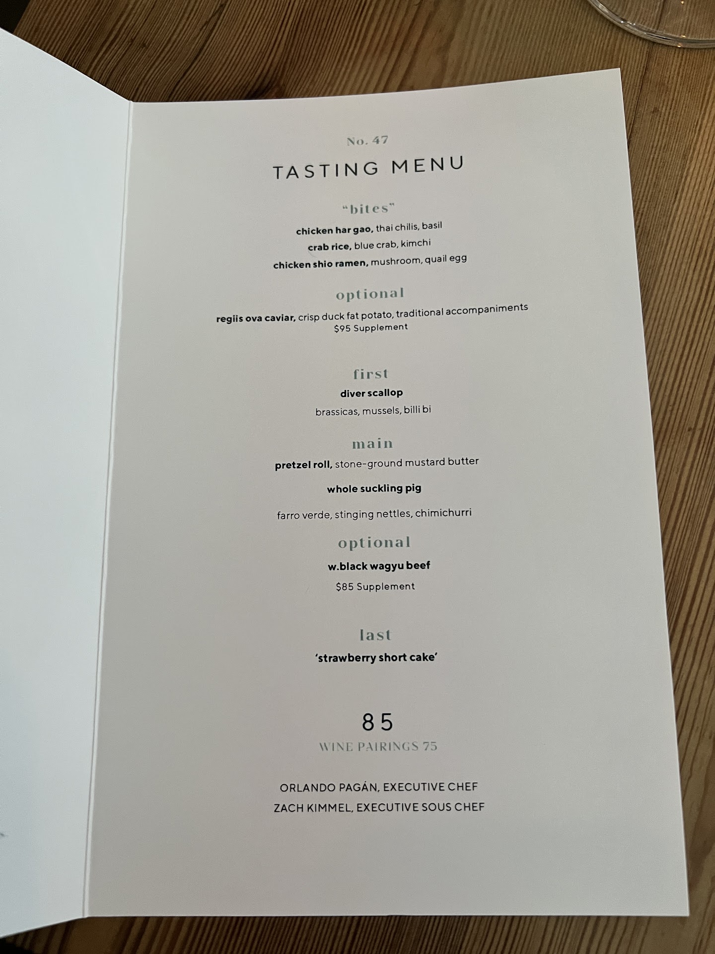 The tasting course consisted of 3 bites (similar to amuse bouche, but you’re paying for it 😂), a starter, a main, and a dessert. We didn’t do any optionals as we were super disappointed at Zero George and didn’t want to risk spending so much money to be disappointed, but after our time here I’m sure it would be worth it.