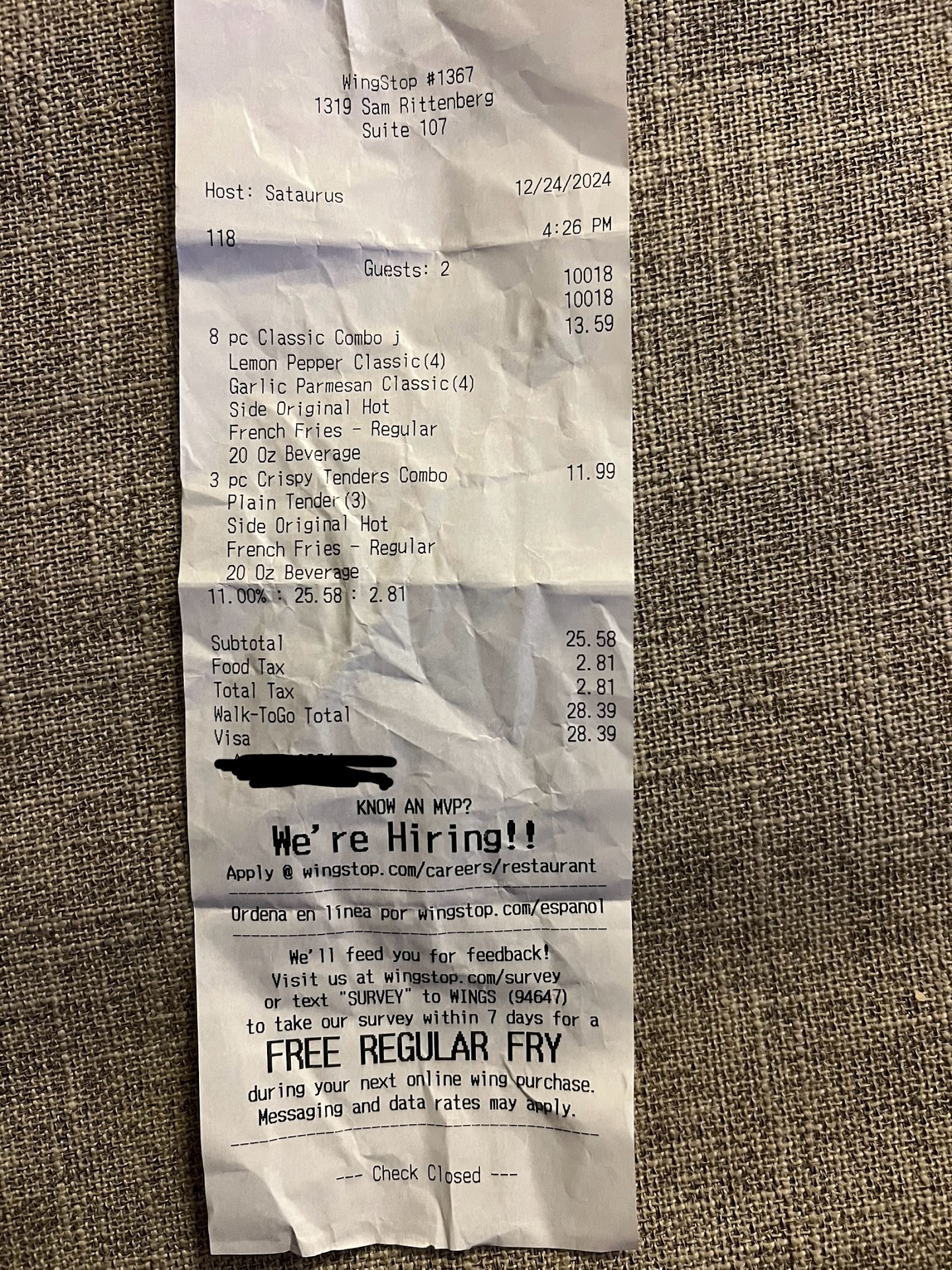 Read moređ§The staff received Holiday pay today tooâŠ. The staff did not care about service the lady running the register was eating and smacking while taking our order of almost $30 to waste because it was nasty. How can a franchise company allow young adults to run this business with no will of working. Itâs sad because let someone else have a job. I have worked fast food as many and never understand how people can treat an establishment like itâs their house not a business. These comments about this place falls on deaf ears because whoever owns this only cares about getting business obviously not the service it should be providing. We were only visiting and would never tell anyone there is a wing stop in the area. Should have left but it doesnât change the service of the fast food industry that supposed to help with job production but no one wants to work. I cook for us but when out visiting other states it is a sad state to see how the job market is. Oh and the sauce we asked on the side Ranch they said they didnât have but I wanted Hot Hot sauce and I have no idea what was put in these containers. Just kids playing around in the kitchen. Dirty atmosphere no trash can and people just hanging in the back having more fun playing than doing the job they were being paid...