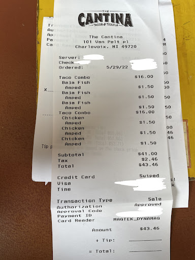 Read moreMUST LOVE LIMES!!! In EVERYTHING!!! The GREAT disappointment.... Worst $40 for 2 people I have spent in many years. (Went with 6 total people. Bill split 2/4.) I'm baffled about the 'good' reviews! Honestly, between the horrible food and how the server dealt with every question or situation we had...... This was absolutely the biggest disappointment I have had in over 20 years in ANY restaurant, bar or anywhere who serves food and alcohol. We have heard that The Cantina has recently switched owner's. This MIGHT explain the cinnamon in the salsa, the overwhelming amount of lime in the guacamole, lime in the sour cream (Yes, this IS their only sour cream), lack of ground beef on the menu anywhere and just plain poor quality of food across the board! However, new ownership does NOT explain terrible service with a poor attitude, food taking an hour to come (not very busy at all). The straw that broke the camel's back was that the server took it upon herself to split up the cost of the chips and salsa appetizer that one person ordered at our table. We had 2 checks at our table. Whoever orders an appetizer, it should go in their bill! This server, literally, divided the cost in two, and charged half to our bill and half to theirs. When we attempted to address this, the server took the check's, switched then TOSSED the checks right in front of one of the teenager's at our table and said "Here! I fixed 'em!" So.... Done being nice at this point, we went to the manager! The manager was not only unprofessional, but had no idea how to handle the situation.