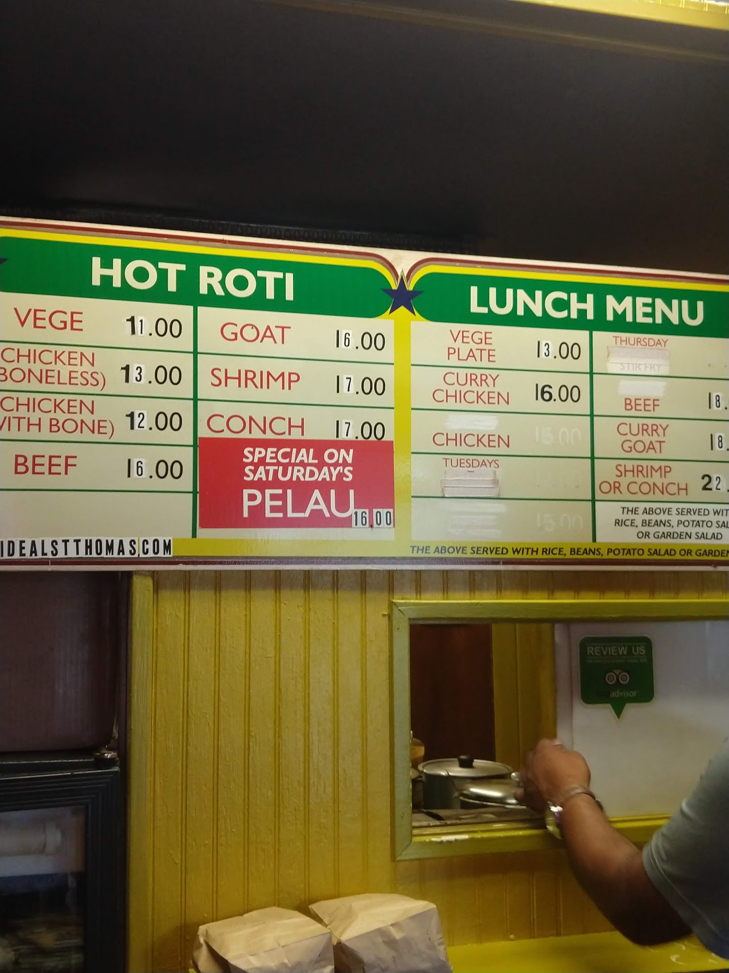 If you are on a day trip from one of the cruise ships, and will only be here once, try the Goat Roti ($15) or the Curry Goat Plate ($16). It is absolutely mouth watering delicious! A good runner up is the boneless chicken roti ($12) or curry chicken plate ($15). Of course you have to wash it down with the region's version of bud light and get a "Carib Lager". I love the Shandy Carib, which they carry, its a good but strange tasting flavor of a beer (Sorrel) that you keep on drinking, because the flavor is just so different.