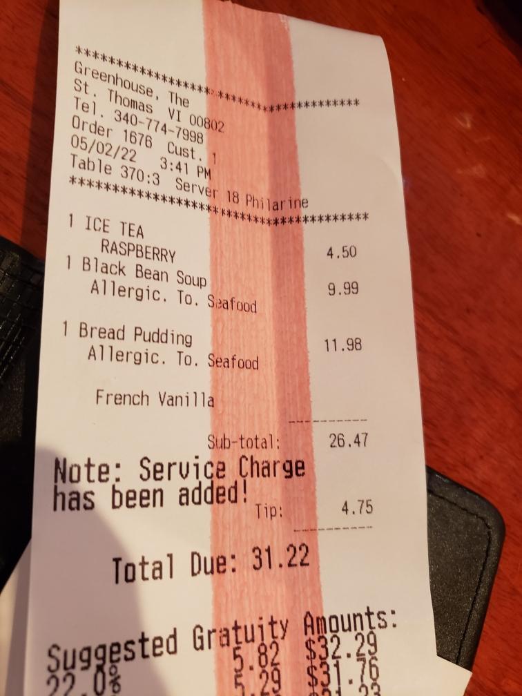 Read moreOur visit was 2 May 2022 after someone told us this would be a great place to eat. We saw it a couple of times, saw it was crowded most of the time around dinner, it is in downtown Charlotte Amalie where cruise ships come in and Carnival was going on. They have covered in/outdoor seating and the place had a nice island décor vibe. We went out last full day on the island, with Carnival over and no cruise ships in port. Needless to say, we were disappointed. You could not get ½ lobster or they did not have all ingredients to make lobster bisque soup, but you could only get lobster tail. Which 3 wanted in our party of 6. Also, one of us wanted fried fish was also unavailable. Okay, we are on an island, surrounded by water, so are there no good fishermen that could provide. However, we saw two gentlemen working their tail ends off while we were there, but our waitress was lazy and none caring. Sad thing is they charge gratuity on your bill, so I guess she figured she was going to get a tip anyway. We had to ask her for multiple items to bring and she kept forgetting. We say a couple of other tables next to us having the same problem. One time she disappeared in back, not looking at her tables to ensure no of us needed anything, then came back about 15 minutes later. We asked her did she forget the containers she was to bring back and she chuckled apologize and said she forgot because she had just come from the bathroom. So, you can only imagine what was going through our minds. The food was nothing to brag about neither. Ribeye has to be sent back to be corrected. So, we were not impressed at all with this place. Maybe their social hour and drinks might be good, but for a seriously good...