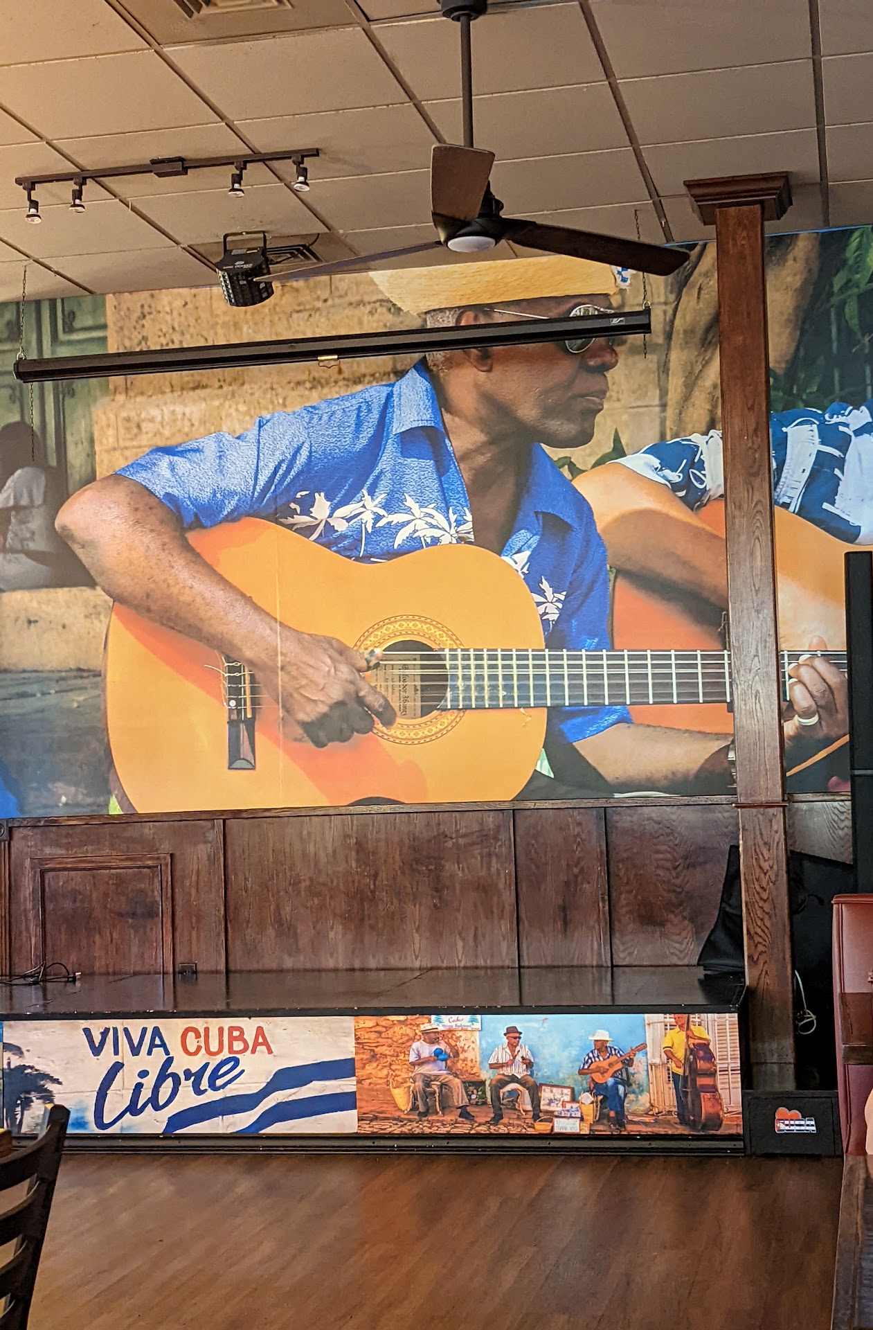 Hard to know where to even begin with this review.We called a week ahead for a party of 20 so they knew we were coming. We got there at 6:45 pm and were seated immediately at our reserved place and the place was pretty empty (it grew fuller and fuller and time passed). We were served three to four plates of food at a time and I was in the last group to receive and my plate came at 9:05 pm. The food was cold and I don't say that lightly. Cold to the point I could not eat a lot of it. Everyone I am sure can relate that Cuban food is awesome when hot, but not so much when cold. Their food (the food I did eat) was pretty bland so don't expect authentic like in Miami or Key West. The maddening thing was tables of three and four people around us who came in way after us, kept getting their food on time as we were kept waiting with our food trickling in three or four plates at a time. We got our appetizers with the meal at 9:00 pm when our food came when we ordered at about 7:15 pm. That is just ridiculous. I watched as three females employees stood at the front near the hostess doing nothing and talking. Males employees standing doing nothing. They looked like they wanted to be anywhere, but there. I blame the owner/manager who we politely complained to (but not until after two hours) and he was useless and I don't say that lightly either as I know the restaurant business is not easy. No explanation and did not even go check on his kitchen until after quite sometime. The best he could do was offer us two free flasks of sangria that probably cost him a couple of bucks. Seriously? Musicians were great, but don't plan on having any real conversation at all during your three hour wait for a meal because the music is way too loud ALL night long and you can't talk to the people in front or you and you have to talk in the ear of the person next to you (literally) to be heard. It really does not need to be that loud to be good and fun. Not fun when you are waiting over two and half hours to eat and you are getting hangry. I read other reviews who say the same thing. How many bad review do you need before you lower the sound volume on the band's speakers so patrons can enjoy the band and the people they are with having dinner. The only thing that made this enjoyable was the people in our group who all did our best to take it in stride. A less polite group would have seriously raised hell over the lack of service. The owner seriously needs to get his act together because it was not for a lack of staff, it was due to a lack of training and organization on his part...