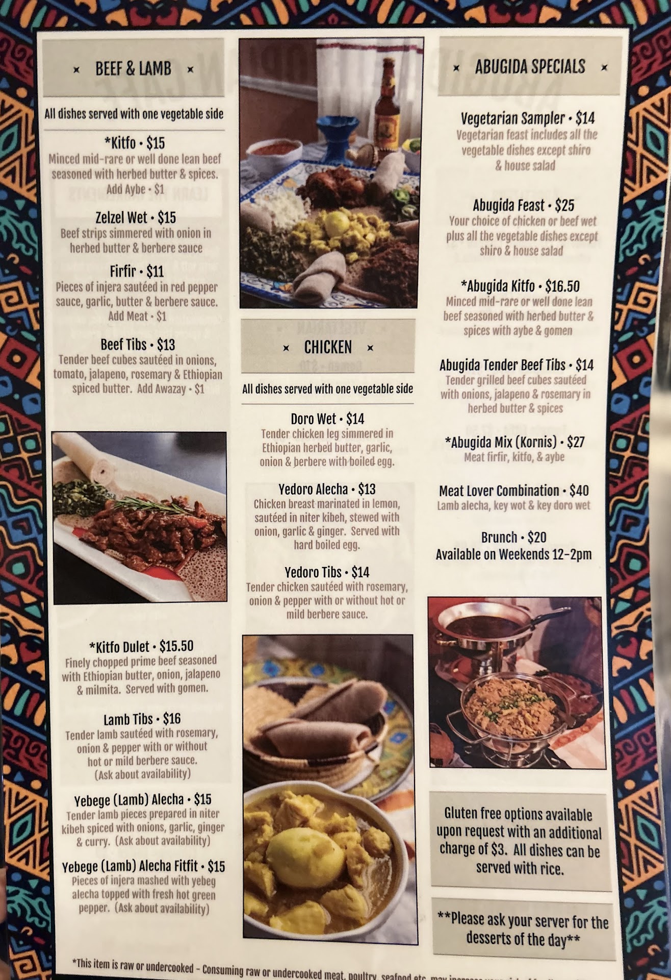 The atmosphere of the restaurant was charming, with vibrant colors and traditional decor that gave the feel you were stepping into a restaurant in Ethiopia. The staff were incredibly knowledgeable and went out of their way to assist me with the menu. As a first-timer to Ethiopian cuisine, I appreciated Yoditaâs patience and enthusiasm in explaining the various dishes and the unique flavors I could expect. She asked questions to see if I liked spicy or preferred beef or lamb or if I was a vegetarian.