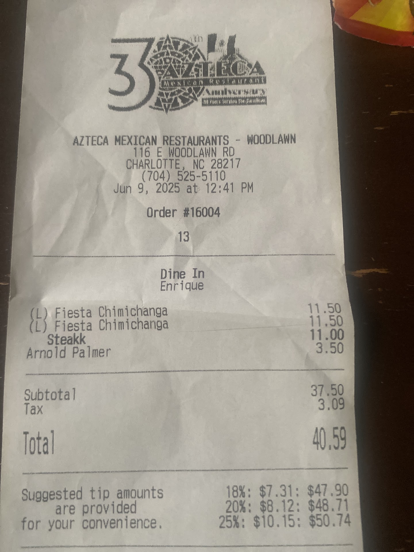 Read moreI’ve been coming to this restaurant for many years and haven’t ever had any issues. Today, my dad and I came there for lunch. I got the lunch Chimichanga—$11.50 for beef or chicken—but I wanted steak. The server did say it would be an extra charge, which I agreed to, thinking it would be $3–$5 extra. Then I get my bill and I’ve been charged $11 for steak. I was going to just pay it, but in my opinion, it wasn’t right.