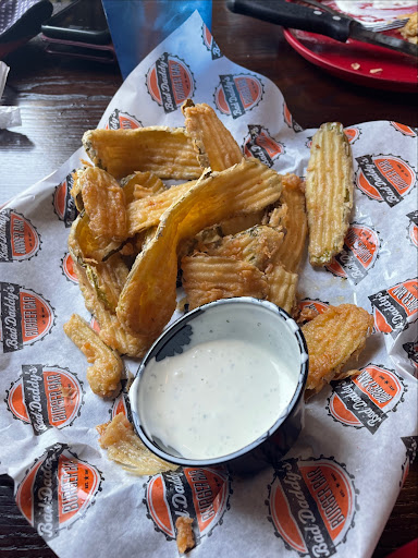 We ordered a round of drinks and an app - Fried Pickles - and when everything came out, they had forgotten my drink and my sisters was contaminated with something like a fruit fly inside of it. The pickles were slimy like they took them out of the oil too quickly and to top that off, the oil needed to be changed. So to follow everyone fries tasted nasty, and not one of us finished our food.