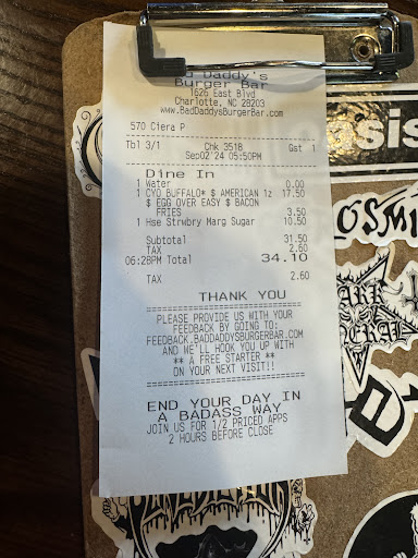 Read moreHave to keep up with the times. Today in Charlotte you can go to a number of nice places where you can get a good burger for a decent price. Bad Daddys is no longer one of those places.
