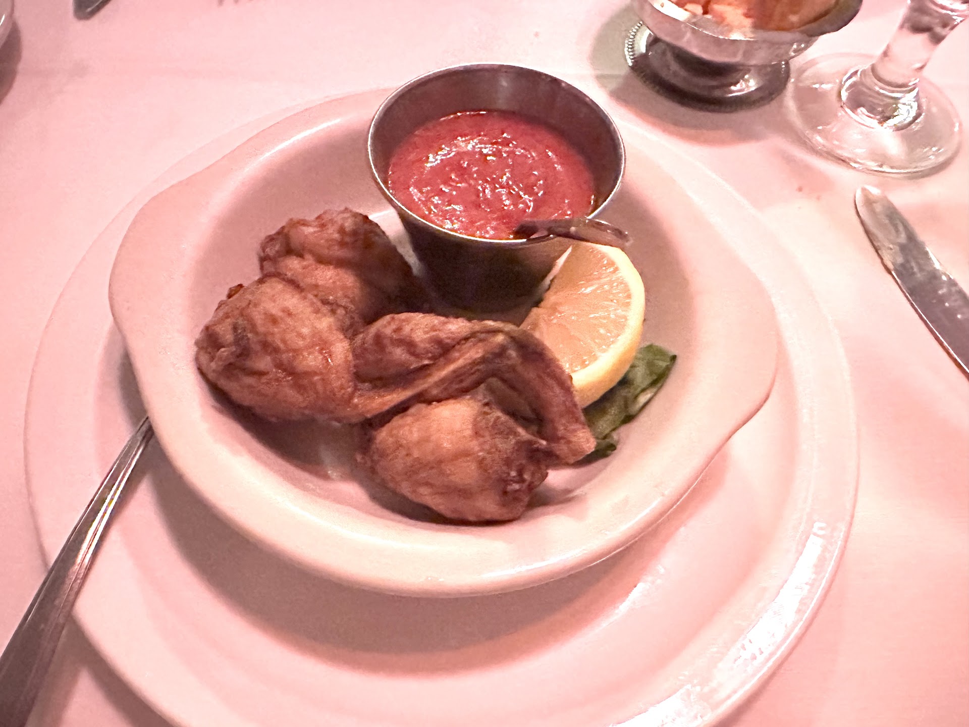 This ramshackle dump is an impoverished man's Bern's Steakhouse but with exceedingly bad steaks. The lighting in this place is so bad you truly can't see what you are consuming. This turned out to be a good thing in the end. David is the server this evening; while he wasn't bad, he wasn't anything special. He was adequate but not award-winning. I put in an order for some Frog legs, fried oysters and their NY strip. The reviews for this place were incredible. I was expecting to eat what was referred to as "consistently being the best steaks in the USA!" Instead, I walked into a cool kitsch time capsule with Sysco's worst. If you sit someone my age in a room dark enough to make a vampire feel right at home, we all know what will happen. Thankfully, I had a companion, so I did not take a quick nap. If anything, I was resting my eyes for a bit. Fortuitously, David returned with our order about then. Looking at the pics, you will see that everything looked as good as the reviews.
