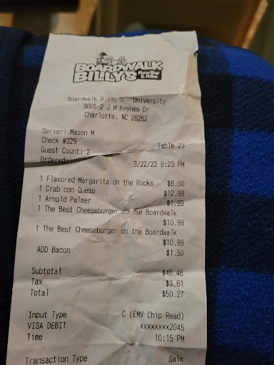 Seafood Selection: 4/5 Boardwalk Billy's excels in its seafood offerings, with a diverse selection of fresh catches that cater to seafood enthusiasts of all tastes. From succulent shrimp cocktails to decadent crab legs and flavorful fish tacos, there's something for everyone to enjoy. While the quality of the seafood is generally excellent, some dishes may lack the depth of flavor or creativity found at more specialized seafood establishments.