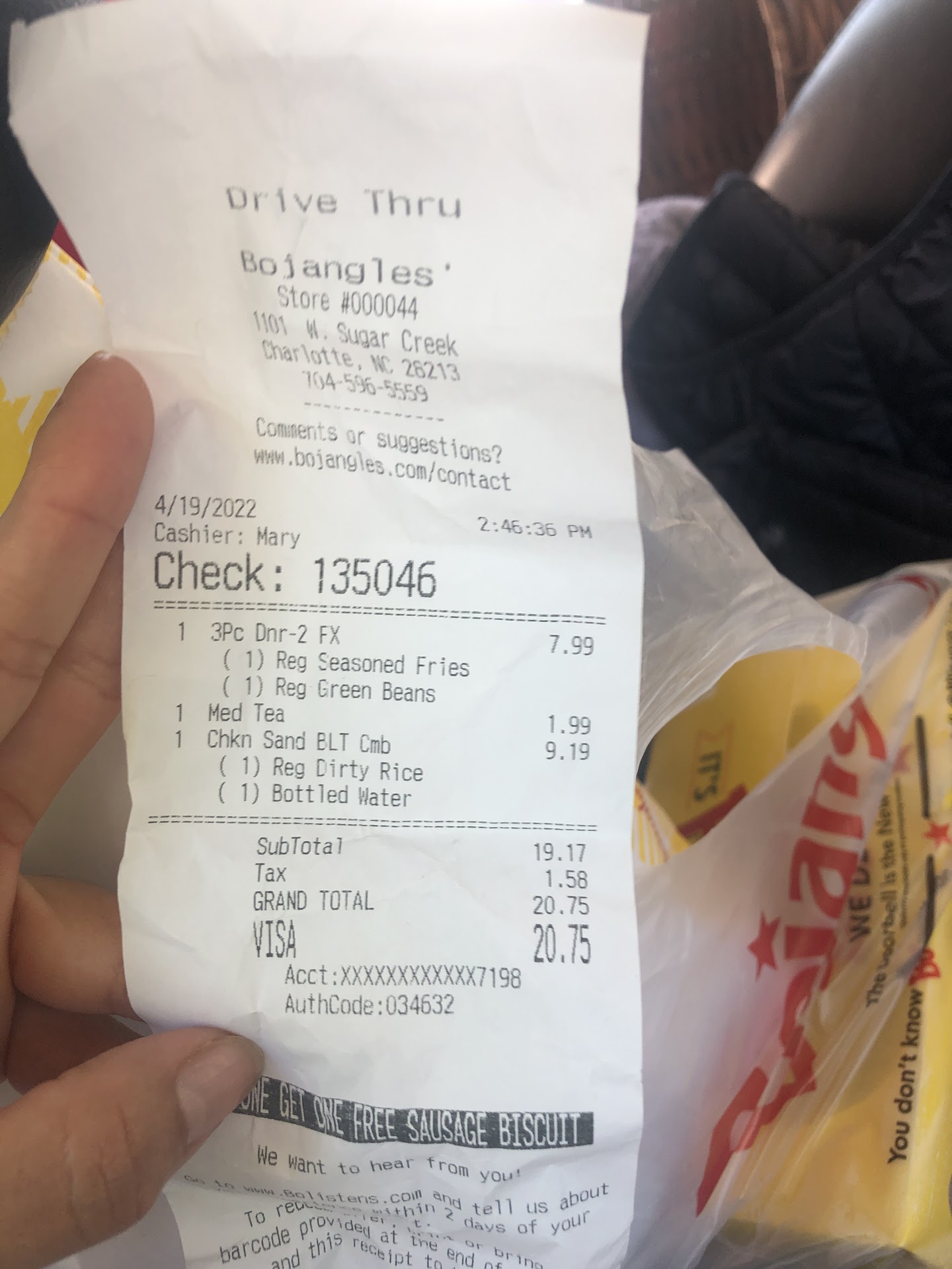 At this point, it's definitely not about a $4 biscuit, seriously. This is about taking care of a good customer for a mistake that BOJANGLES made, not me. I did what I was supposed to do. I make good money, am a Retired Veteran, A Licensed Private Investigator, belong to several organizations, including the Hidden Valley Community Association and I have a non-profit organization for children and work with children at CMS. I have earned the respect that I expect to receive from any establishment where I spend my money. I am an honest man and I am holding Bojangles accountable for their "lack of good customer service" and not recognizing that they are wrong in this situation. Again, it's not about the $4 biscuit !