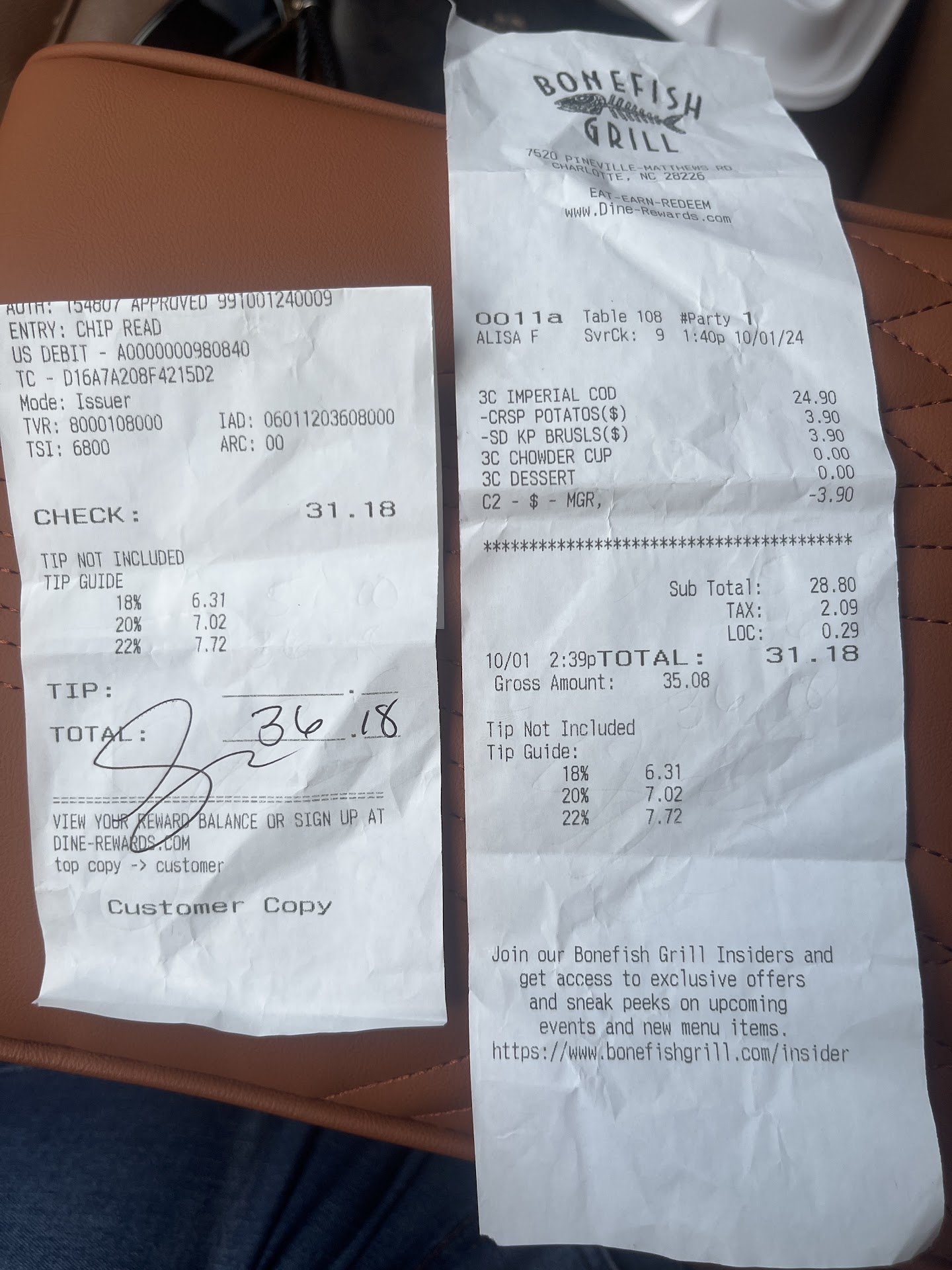 Read moreSo disappointed in how my lunch ended. I ordered the Imperial Cod lunch special. The bartender, Alisa, was attentive overall and everything came out with no issues. The food was excellent! My problem was the cost when I received my check and the way Andrew, the managing partner, handled my concern. My meal came with two sides, I requested Roasted Potatoes and Brussel Sprouts. Alisa notified me that those were premium sides and there would be an up-charge. I told her that was okay… now usually when I eat out, an up-charge is the difference between the cost of a regular side and the premium side.. usually a few cents or a dollar or $2 more AT MOST. However, Bone Fish Premium side upgrade is an additional $3.90 PER SIDE so $7.80 additional on top of the cost of the entree. Now, I take responsibility because I didn’t ask how much the up-charge was, nor did Alisa provide that information, but I was completely caught off-guard when I seen an additional $7.80 on my check. Keep in mind, regular sides are like mashed potatoes, broccoli, etc.. and I upgraded to roasted potatoes and Brussels sprouts.. nothing fancy! I politely asked Alisa about the charge and she stated that’s how their system works but offered to have the manager come over. When Andrew came over, I acknowledged that Alisa notified me of the up-charge, but not the price and I took accountability that I did not ask either. However, Andrew used this situation as a “teaching” moment and a time to be-little me rather than find a resolution. After going back and forth in discussion while in front of other dining guest for almost 10 minutes, I couldn’t believe that as the guest, I had to tell Andrew that I was no longer going to continue the conversation over something so simple and requested to check out, and pay the up-charges, so I can go. He then says, “well I was going to take care of one of the $3.90 charges for you”… I guess it was more important for Andrew to assert his power and privilege in this situation rather than resolve the problem immediately. And despite being offended by Andrew’s nice-nasty comments and him constantly over-talking me, I remained as professional as possible. I gave 2 stars because of the food.. otherwise, I won’t be returning to...