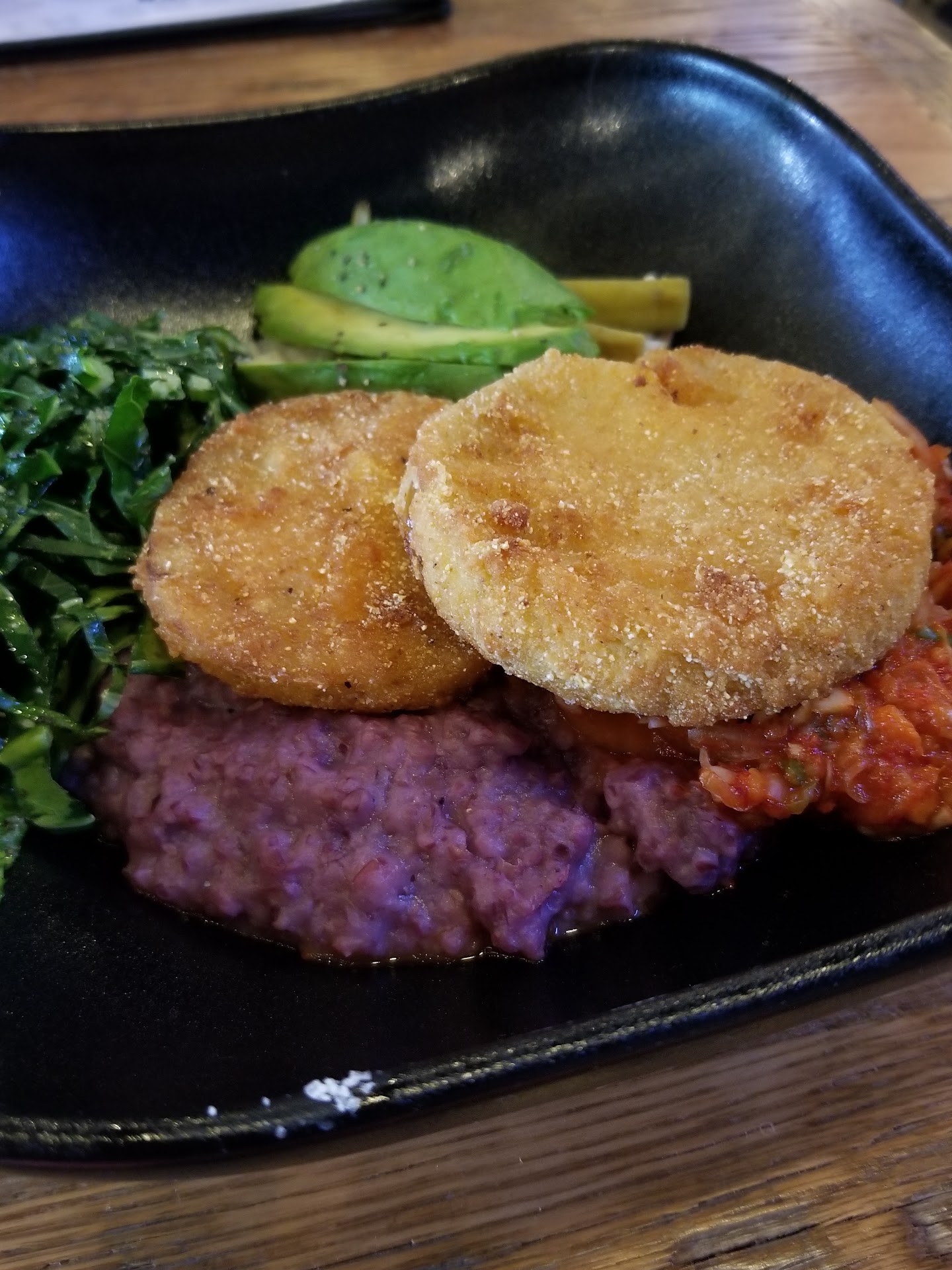 My wife got the Buddha bowl but unfortunately she didn't know if kimchi was and it was super spicy. That is definitely not their fault. I love spicy food and the kimchi was delicious. They also have a kimchi burger and I think that is what I will try next time. The Buddha bowl came with grits, avocado, kimchi, and roasted the greens which were really good. The reason we got the wings was because she wasn't able to eat with kimchi as I she wasn't full afterwards. If you're looking to get this you should probably add some protein.