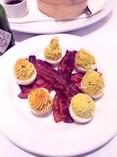 = 5 star food/service/atmosphere = What phenomenal food. 1st time visit for Sunday brunch, highly recommended by friends, and BrickTop's did not disappoint. Exceptionally good food! Our group had 11 people, yet all dishes were served at the same time and each plate was hot. Every dish was delicious. We sampled bites from each other's plates and everything tasted great. The Chicken & Waffles were great...never had that combination before and it was tasty. Prime Rib was juicy and tender.. The Steak & Eggs were much better than expected. The quality of the beef filets used was surprising...they were tender and flavorful. The chicken dishes were both excellent. Their brunch donuts & dips were freshly made, warm, and tasty. Absolutely try the candied bacon, get two orders to save time... you'll want more. The wait staff were attentive but not intrusive. 11 meals, plus several donut orders, plus auto-applied tip was still under $300 for brunch... And that was for outstanding food, served hot and fresh, with great service. We will...