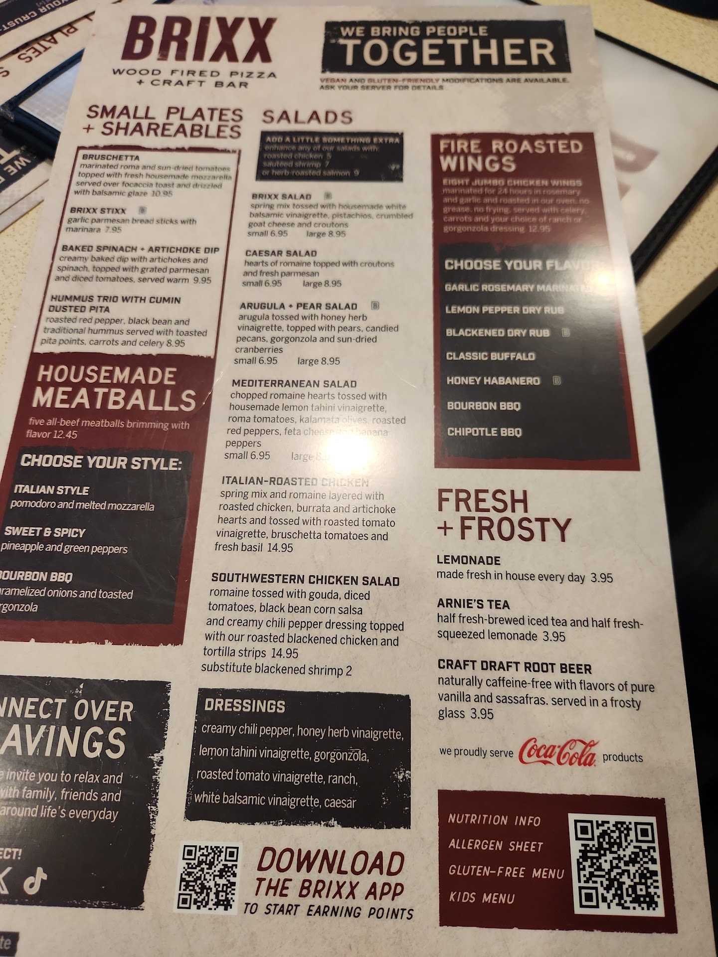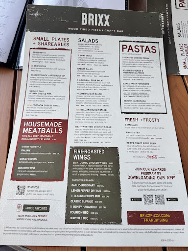 Read moreBrixx is definitely a good way to go if you are craving a bit of everything. This one is located in Dilworth, and it is on the smaller side from their parking to seating inside. It can get crowded. We went on a Friday right at 5pm, and it was still empty, and thankfully so as there were 8 of us. Everything was great in the beginning. Our drinks, appetizers, and food were delivered in a timely manner. Towards the middle of us bring there the dinner crowd did come rushing in which caused our waitress to I believe get fairly overwhelmed. We basically had to hunt her down for everything, straws, refills, cream, and sugar for coffee and even utensils. At one point, we just didn't feel like having to call her over or even wait any longer that we just decided to op out of ordering anything else and just leave. The food, though, was amazing as always. We ordered their Bruschetta, Buffalo, and oven roasted wings, spinach and artichoke dip with piano bread, Ceasars salads, penne pasta and it was all DELICIOUS! it's not a bad spot for food, but maybe this location just...