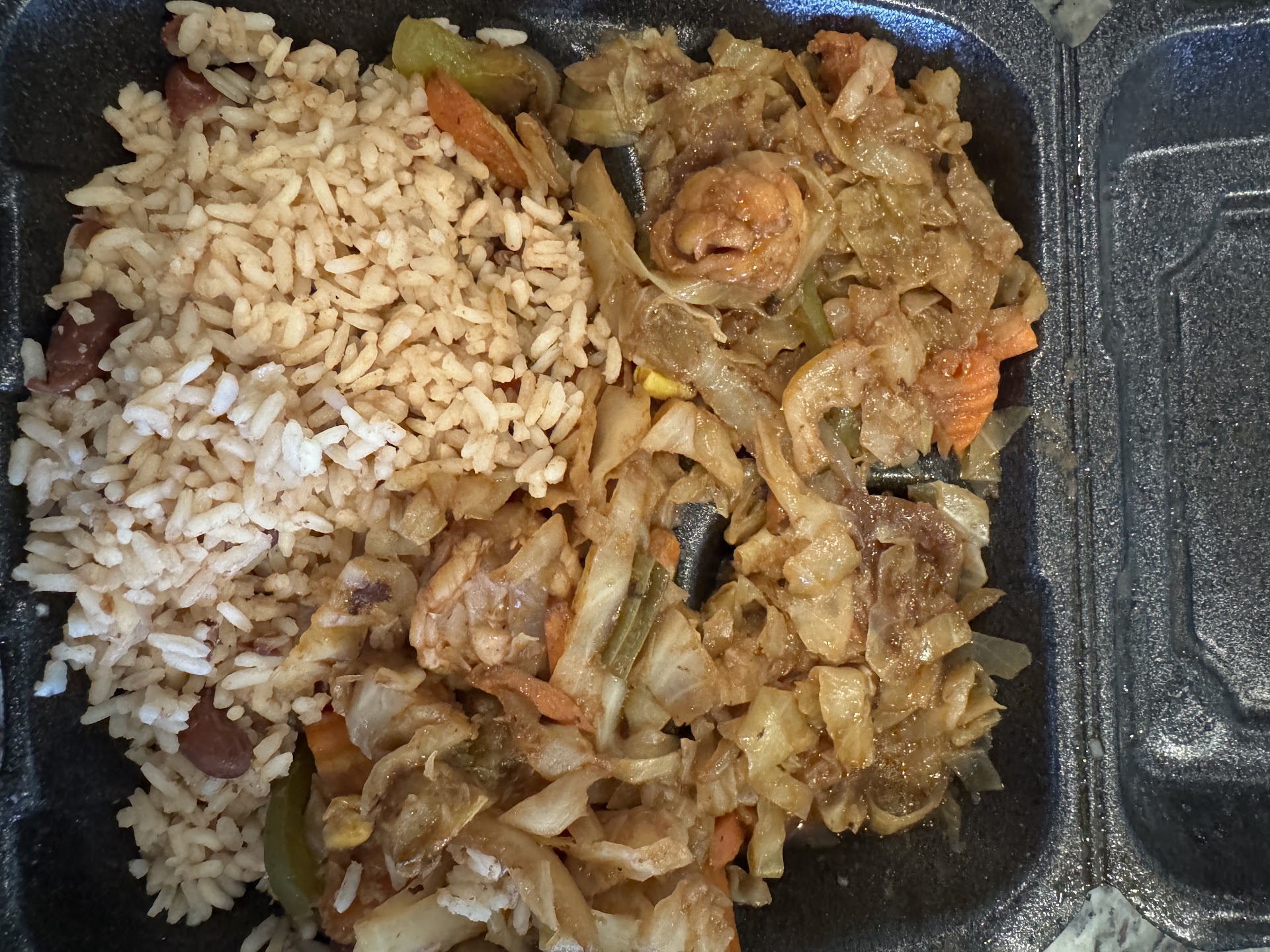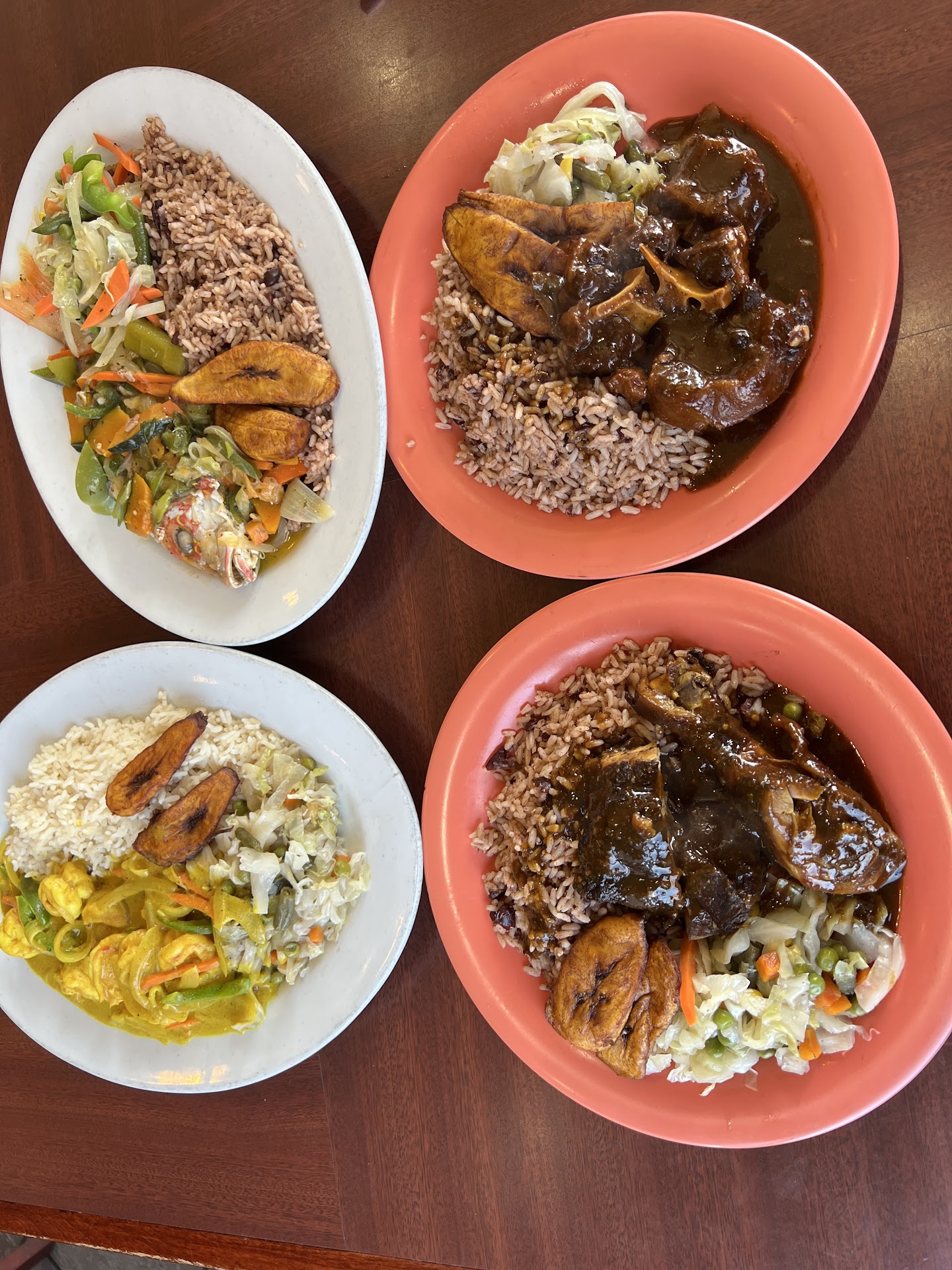 Here is what my we had: Chicken Patty was dry and the crust EXTRA crispy (almost burnt) Beef Patty was excellant Cocobread was good. A little on the dry side but good Oxtails were fatty and taste was bland. The gravy was good!!! Mac and cheese was DRY but had an okay kick to it There was NO CABBAGE.... like really, what Island spot doesn'thave cabbage but collard greens???? smh Plantains dry, Dry, DRY!!!! No moisture, just Sahara Desert dry Rice and peas dry, dry...... Curry Chicken I mean, bolied chicken with sprinkled curry powder. The gravy was watery Now the potatoes in the currry chicken were EXCELLENT! Bottled Ting was AMAZING!!!! šššš Homemade Sorrell was EXCELLENT