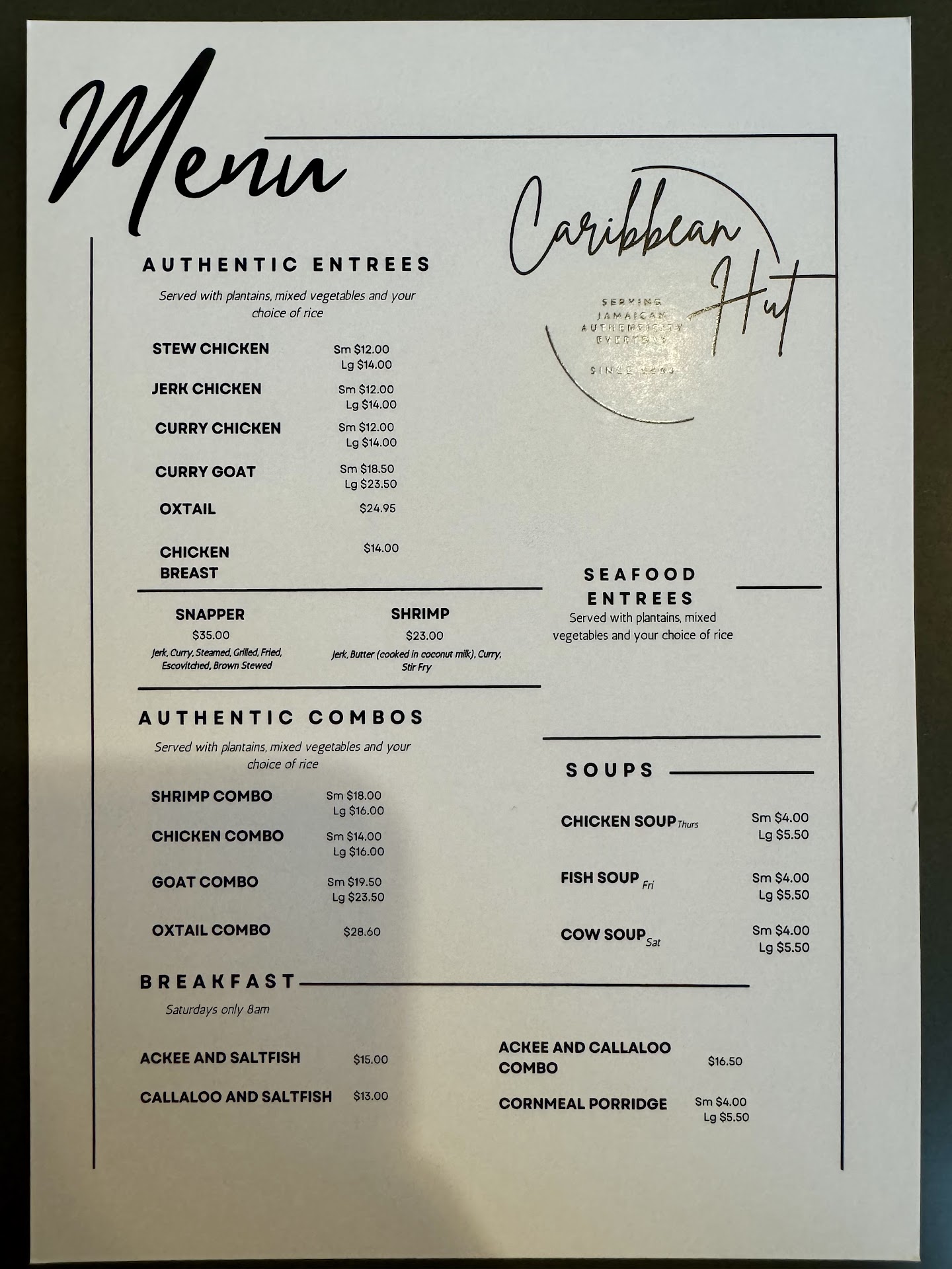 Read moreSo let's start this review right where it matters most. Authenticity. Authenticity is what I felt once I entered this establishment. The restaurant was absolutely spotless. The windows the floors and every table and every chair was clean and ready for the next guest. The entire leather booth looked cozy and ran the entire span of the windows, that gave way to a complete view of the outside seating area. They even have a booth that sits nestled by the doorway that leads to the outside seating. This gave me the feeling of sitting in what has to be found memories of the entire staff of what it feels like to be back in Jamaica. Authenticity was also within the spirit of the entire staff that I encountered. The smiles the warm welcomes and their willingness to get right to making you feel at home. Authenticity was what I witnessed as I watched the cooks delightful within the freshness of these delicious meals. I had the large Curry chicken plate because I'm greedy đ. The chicken was seasoned with the right amount of everything, so I tasted every single ingredient. The plantains were in the words of Goldie locks, just rite. They were not too soft nor were they too under prepared. The mixed vegetables weren't over cooked so the whole mix of them could be tasted individually. The rice wasn't under cooked or over cooked and blended well with the curry sauce. They have outside seating and offer music that is played through a speaker on Saturdays. Stop by soon and you will enjoy this place. It is truly authentic and like being in a place that sits...