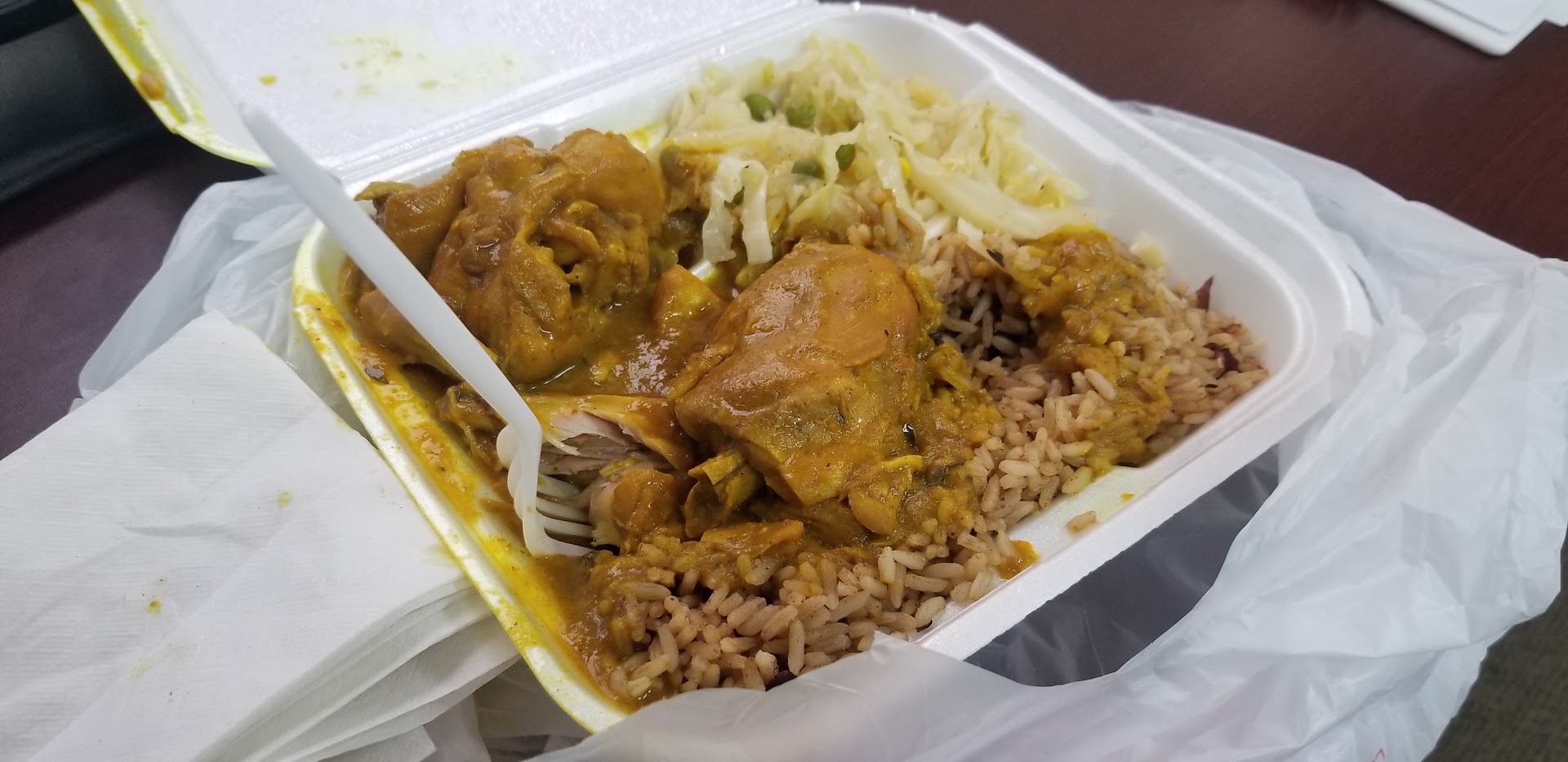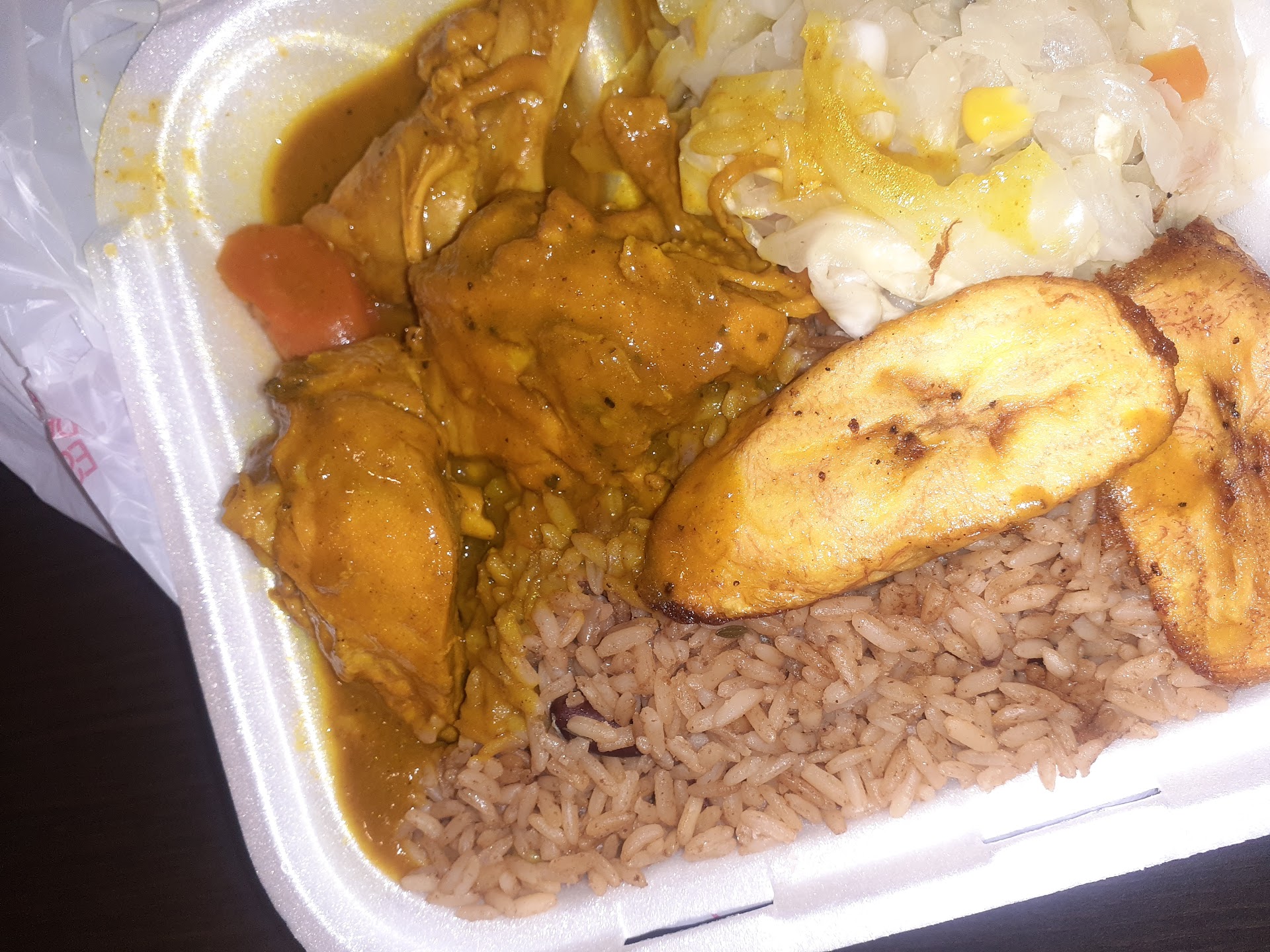 It's a small joint with a sit at bar and some seating available. It had a very very chill vibe that I could definitely groove with. The menu was pretty good looking I definitely have to go back to try the oxtails and goat as my friend brags about how good those dishes are. The young man who took my order recommended the lunch special for 6.99$ so I ordered the curry chicken plate to go.