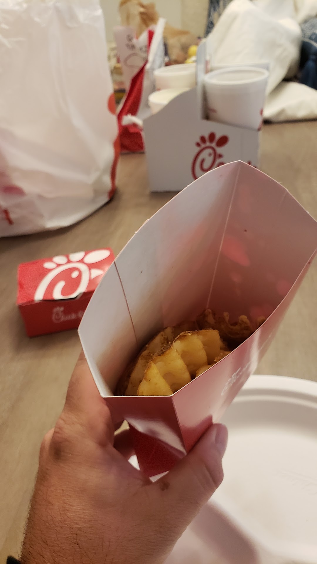 When I finally got the food it was all crammed into a small/medium white bag looked like it was about to bust, I did ask for a larger bag. Fries all sticking out the top, grilled chicken sandwich box smashed like a pancake the nuggets under that box smashed even more. Fries were soggy btw. Just another very aggravating...