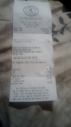 Came in lunch time, no line. This was by far the worst chicken burrito bowl and chips I have ever received from this location. I generally boast and brag about this particular location and I have also recommended it in my Google reviews of other chipotle locations, as I’ve never had a bad experience. The chicken in my bowl (can you spot any in the picture? Right, neither can I!) was completely overcooked, and it wasn’t even chunked chicken, it was little tiny, shredded pieces as if it was being stretched out to be portioned and it was bland, had no taste whatsoever and no seasoning. I basically got little to no chicken. The black beans were overcooked. The brown rice was overcooked. The veggies were also overcooked, completely soft and it also had no taste, no seasoning and was completely bland. The chips were extremely salty and inedible, and completely greasy, the oil went straight through the brown bag as pictured. The chips did not help the tasteless bowl ingredients either actually made it even worse tasting. And to add, I ordered large chips, but basically received the size of regular chips bag. Also wanted to note that I was asked if I wanted queso, I said yes on the side, the line worker pulls out an already packaged one and I didn’t care for that, I was looking at the fresh queso out and thought she was going to put that in a cup..I said something about it being fresh and she said she had just sat out the one she packaged and gave me. If I’m inquiring, just scoop me up some fresh queso that I can see you prepare in my face versus something I did not and don’t know how long it was sitting out for someone else. Anywho, should have said no on the queso because it wasn’t good anyway, waste of money. Overall, the chicken bowl was completely tasteless. There was no seasoning. There was no taste whatsoever, completely bland. I wasn’t even full after eating and ended up throwing away what was left bc it was that bad. I’ve never had a chipotle bowl like that ever, there was no flavors to it which was extremely disappointing and I’ve never experienced that particularly from this location which I have frequented and always recommend. I don’t live in the area but I’m a UNCC student and was in the area and decided to stop in. I completely regret it and want a full refund, that meal was not worth it and was a waste of my hard earned money. Completely disappointed and dissatisfied with the food and experience, this is not the Chipotle...