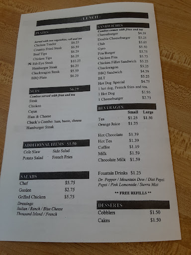 Read moreChuck"s Grill, what can I say first of all it's a little side road old school shack, don't mean any disrespect, it take you back when it was the only little place in town to get something to eat , very small it had maybe 6 large tables and maybe 4 small ones, it's a little community place where they know most of the customers by name If you want to wait for 35 mins for brkfst or longer, I went for the brkfst first time my last time .People seem to like the fact it's cheap, 2 eggs choice of meats get 2, French toast, and only reg coffee no decafe, all for around $5.00. It just remind me of a little grease spoon of a place, My friend took me there and she seem to like it, it's not a place that I'd return to, and you may have to sit with someone you don't know and there is nothing wrong with that as I said your sitting on one another already, yes to close for comfort for me ,we were at a table against a wall suppose to be for 2 but really it should of been for one person, 2 young men seen us sitting there looking very Uncomfortable and they were being seated at a lg table , and offered us that one which...