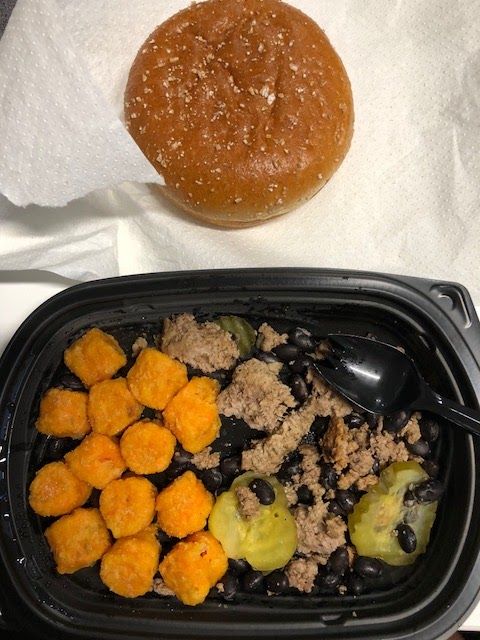 We got our food, and I was initially impressed by the turkey burger, and the multi-grain pita style bread. The turkey bacon was just OK, however the low fat cheese was a mistake. It would have been far better just plain. It included a large slice of tomato, and some assorted greens. The side salad was just plain chopped romaine with a small cup of dressing.