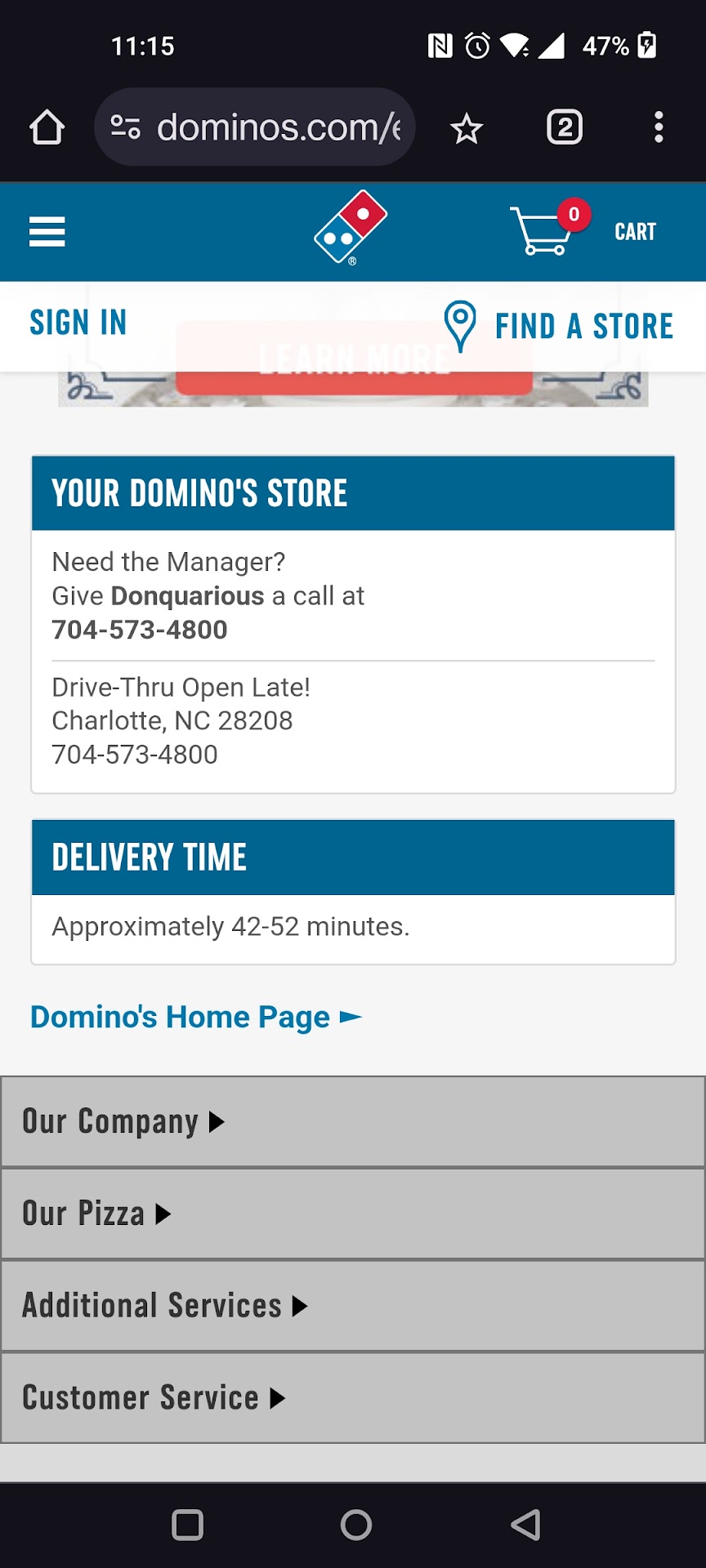 Last Sunday evening I ordered from the store located on Freedom drive. Not only did it take an hour and a half to arrive (the app stated 33min), but when it did, all of the items were cold. I was given the wrong pizza (which was overcooked), bone- in wings when I ordered boneless and the molten cake fillings were all on the bottom of the cardboard box. I tried to contact the store, but no one picked up the phone.
