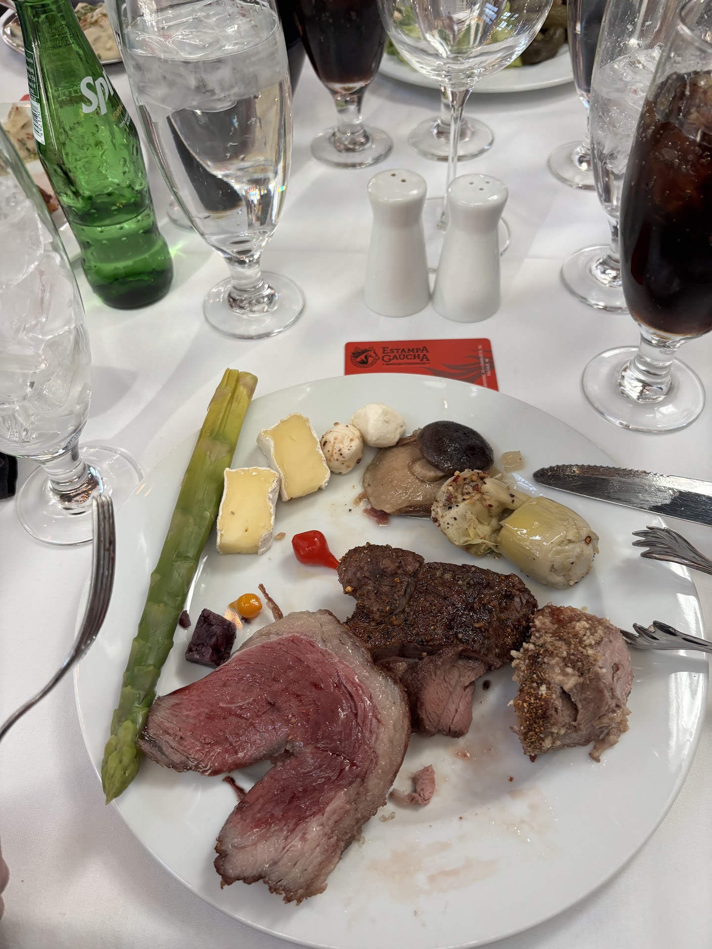 Read moreI'm disappointed in our experience at Estampa Gaucha. I treated my boyfriend for his birthday to one of his favorite food experiences- a Brazilian steakhouse! We've been to numerous ones in the past in both Chicago and Tampa. This was our first time visiting a location in Charlotte. I did my research and was between booking here or Rios. I landed reserving a night at Estampa's. The food was a 7/10. Some of the chicken was far too salty to enjoy or consume, but taste is always up to personal preference. Where things went south with our experience was the alcohol. We ordered a bottle off the wine list and they did not have it in stock.. No problem, we picked the closest tasting other option. At the end of our dinner, we noticed the server and manager/owner walking around visiting each table with a bottle of liquor and juice. He seemingly poured a glass for every person at the other tables. The employees walk over to our table and describe the purpose of the liquor as a digestive and immediately begins to pour us two glasses and chit chats. After they asked for our opinion on the taste, they brought over another round to drink. Well, the check comes around and to my entire shock and surprise they had charged us nearly $60 for 4 tiny glasses of this liqueur. I felt so slighted by the employees and lack of communication and deceit that I did not want to ruin the night for my boyfriend's birthday. Why in God's name are you not disclosing that this is not apart of the experience/complimentary? It's shady and unprofessional. $60 would have covered an entire other person's meal at your restaurant. I will not be back and a word to the wise that visit this place, start asking questions to your servers because they clearly aren't trained on disclosing what is included in the dining experience.
