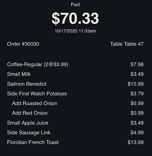 Regarding the coffee, my spouse requested milk instead of creamer. The server brought out a full glass of milk (we didn’t ask for a full glass a milk), she have put it in metal dish they put the salad dressing in, and charged us $3.49. It was unclear why there was an additional charge for milk or why we got charged it for.