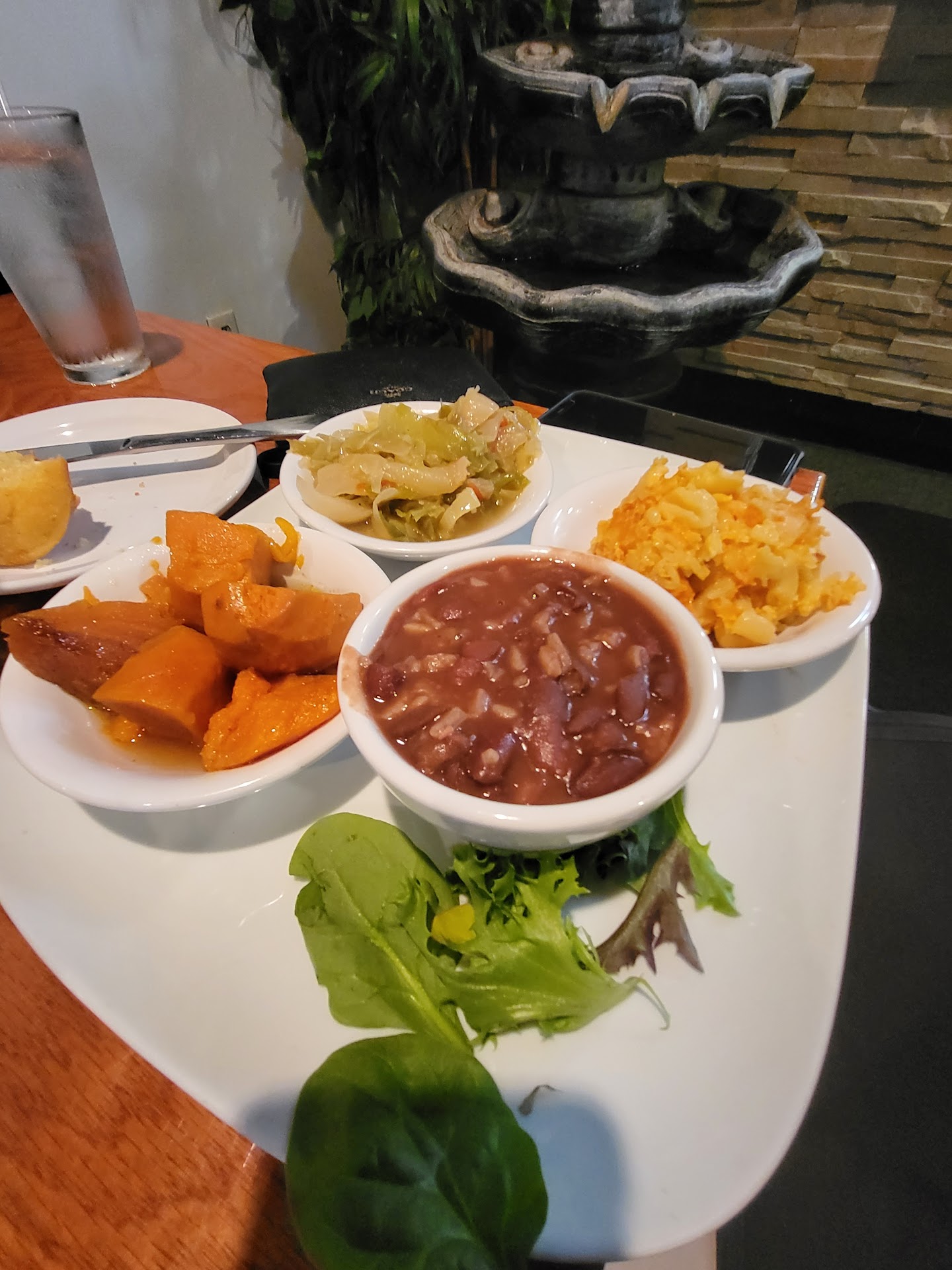 Read moreA long-time friend and I went to Freshwaters this past Sunday because I support black businesses as much as possible when I go out of town and we were in town for a comedy show. My friend and I notice a few celebrities in pictures with the staff of the restaurant which was nice at the entryway. We arrived around 4:00 in the afternoon. We waited for a little over 10 minutes until we were sat down. I'm unsure if the heat at the entrance was because of the door opening and closing or the air wasn't on. The waiting area at the entrance was tight so after a couple of more customers stepped in it was cramped. After the older lady realized multiple customers were waiting we were taken back to our seats. There was water waiting for us at the table in nice glasses and we were seated by the only waitress, a young female. We were given our menu and we looked for options to eat. My friend and I each ordered some greens (she had string beans and I had collard greens) and mac and cheese with a slice of sweet potato pie. I wanted to try the salmon cakes for an appetizer but from my understanding appetizers were not available. We were given cornbread while we waited on our food and it didn't seem like our food didn't take long to arrive to the table which was nice. I want to first start off saying that my Mom and Grandma set the bar high when it comes to southern cooking. I ate most if not all of my food only because I don't believe in wasting food, plus I was hungry. My friend however did not eat all of her food and blamed it on her being stuffed when the waitress stopped to check on us. We did not enjoy the sides and I could only imagine the feeling if we would've ordered entrees and they weren't good. Freshwaters is rated well and we trusted that, but unfortunately it didn't work out for us this go round. The people around us seemed kind while we sat to eat and chat, minus the side conversations we overheard...