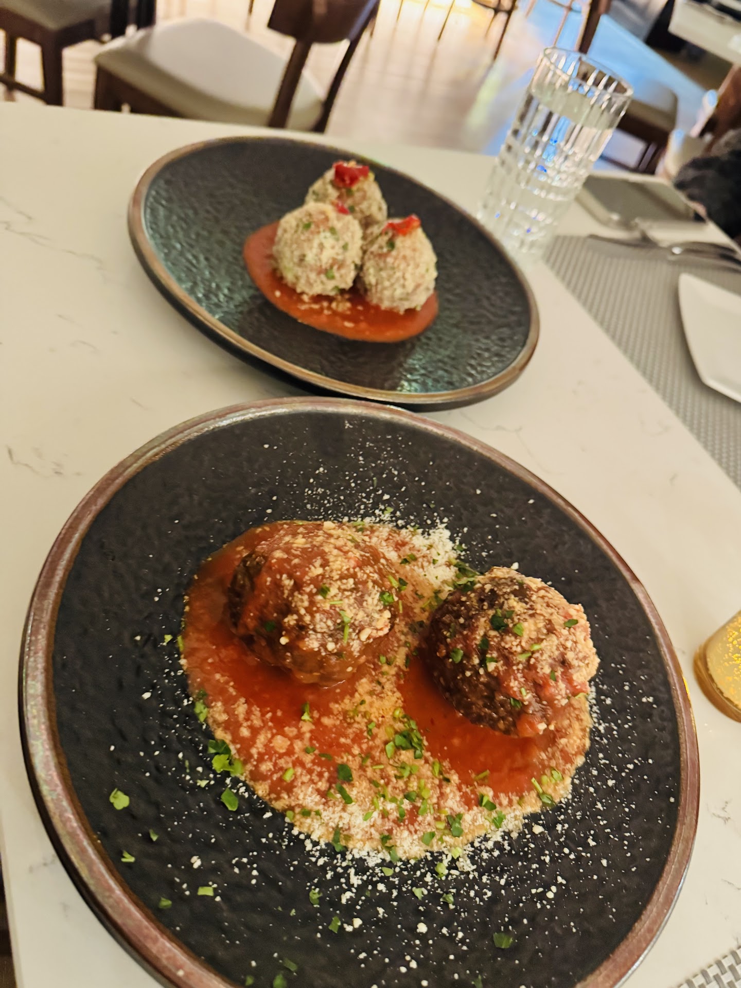 The menu is concise, focusing on unique daily specials rather than typical Italian-American staples like chicken parmigiana or baked ziti. I kicked off my meal with the Stuffed Baby Portabella mushrooms, generously filled with Italian sausage and resting on a scrumptious housemade vodka sauce—a delightful start and great for sharing. The Meatball antipasto followed, featuring three well-seasoned, albeit slightly dense, meatballs atop a robust housemade red sauce.