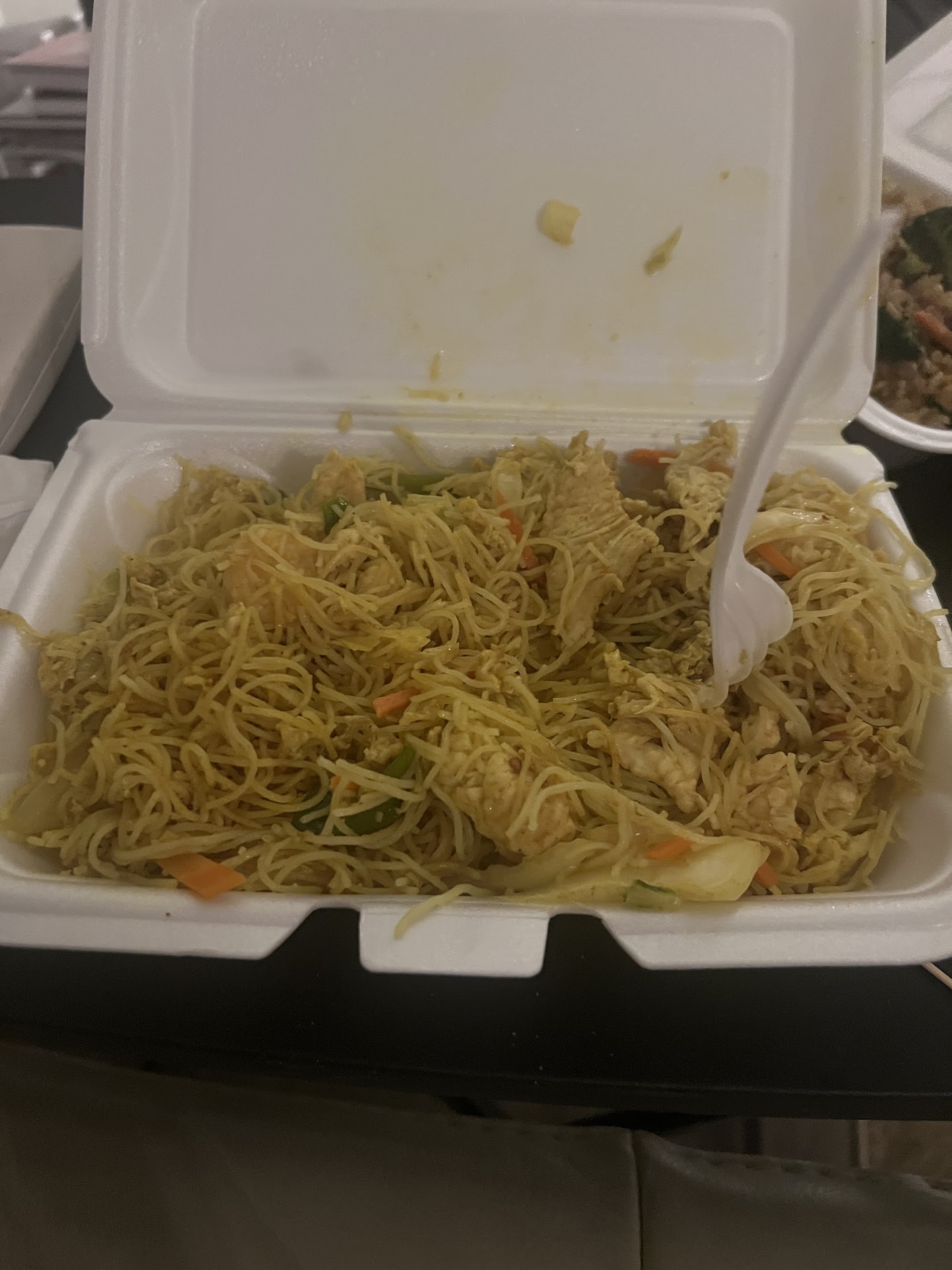 The food was packaged in two separate containers one with three large Egg Foo Young patties and another with shrimp fried rice. Unfortunately, the rice container was not filled, resulting in an uneven ratio of Egg Foo Young to rice. After eating one patty with the rice, I was left with two more and nothing to pair them with.