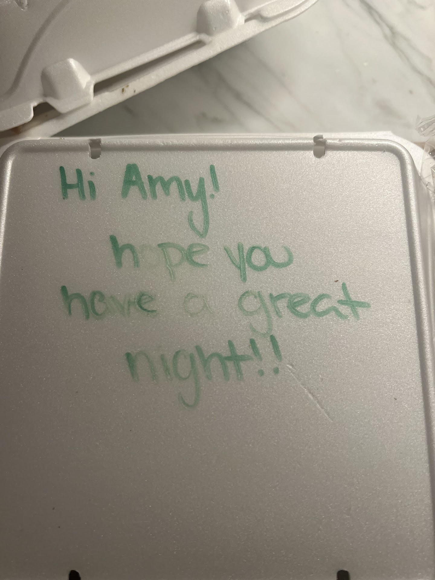 Read moreI just have to say what a great place this is! I’ve been ordering here for years. Their food is always fresh and flavorful and the people working there are courteous! Tonight I ordered from Door Dash and wanted extra Pita. There wasn’t a place to order on the app and I told the gal on the phone I was happy to pay for it. She said, “no problem, I’ll throw some in no charge.” I told her she was the bright spot in my otherwise difficult day. And when I opened my order I saw this message on the box. It almost made me cry because I had just come from cleaning out my Moms house and she recently passed away. Kindness is so meaningful and this person had no idea what was going on-she’s just a wonderful person spreading kindness. Thank you Greco Fresh! The food is enough to keep me coming back but now they have a customer...