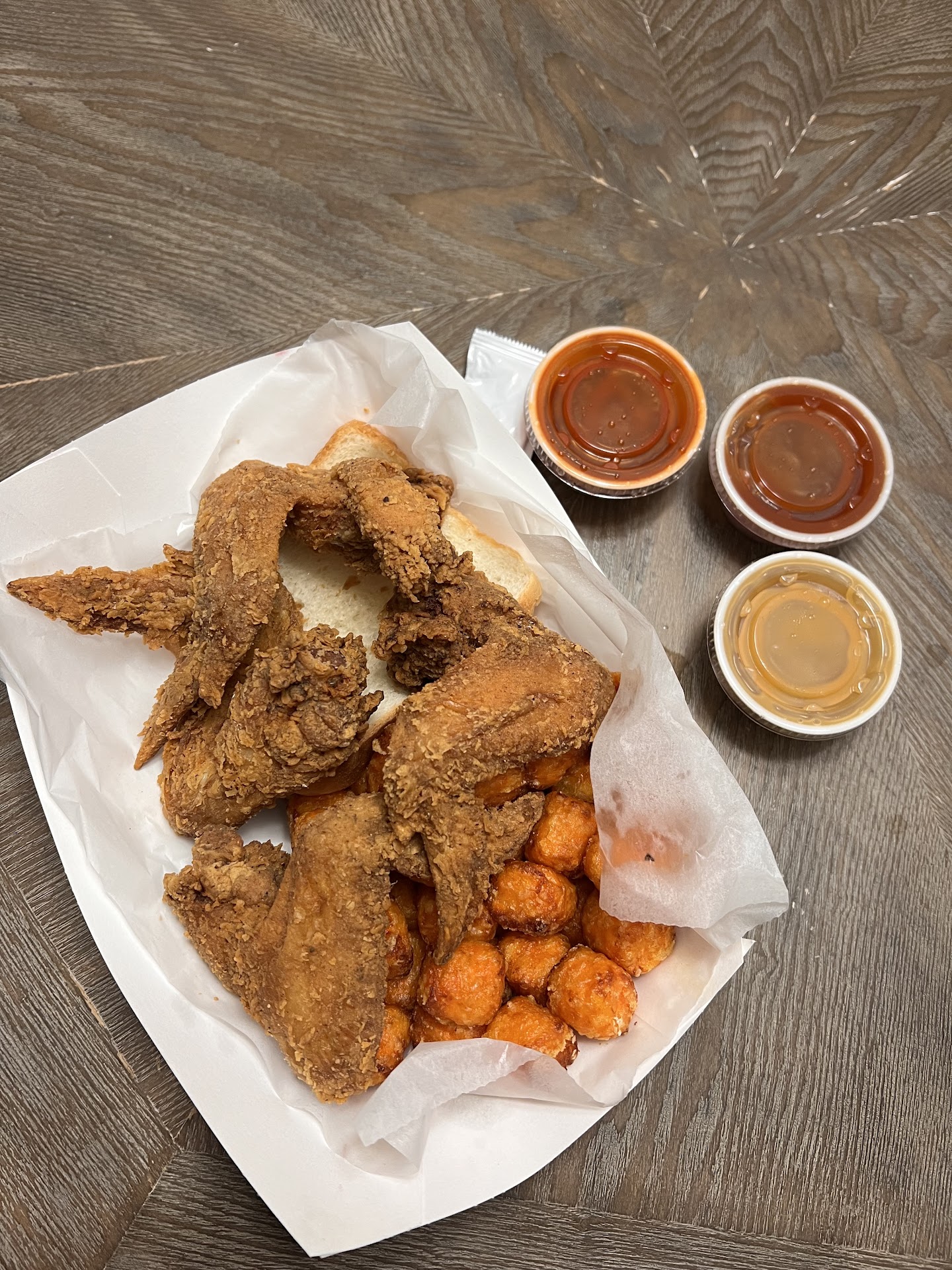As I waited for my order, I kept hearing the online order system go off. Iām not sure where the disconnect is for some when trying to order online but apparently it can be done. My order probably took less than 10 minutes and was just as I requested. No coleslaw and sauces on the side. My food remained hot throughout the five minute drive home. The chicken had a good texture and although it was fried on the harder side, it wasnāt overcooked. The tots werenāt anything special but the sauces were what I had difficulty with deciding if I liked or not. The lighter option was sweet and the most likable. The mild sauce (Mambo adjacent) was thick, bland and you can tell that itās ketchup based. The hot option has potential but reminded me of Frankās Red Hot and didnāt even bring out a drop of sweat for me. I love hot sauces so I was disappointed.