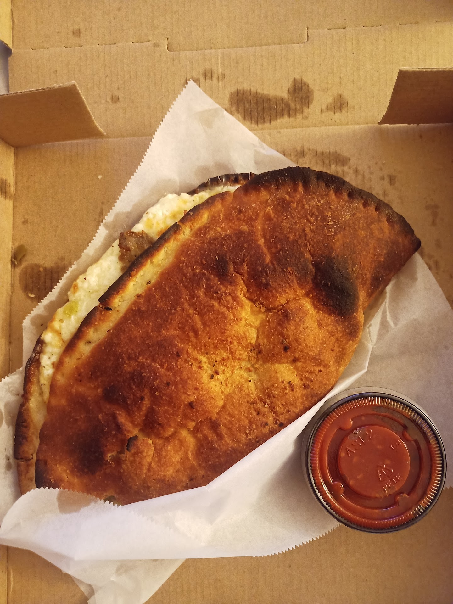 Craving a calzone and enticed by Hawthorne's late-night service, I placed an order with the expectation that my hunger would be appeased promptly. I arrived five minutes early for pick-up, hoping to enjoy a fresh, piping hot calzone. However, what I received was far from the New York-style calzone I had hoped for. Upon opening the box, it was immediately evident that the calzone had been overbaked. The dry, burnt crust dominated the entire experience. As a native New Yorker accustomed to the delight of pillowy dough and gooey cheese, Hawthorne's rendition fell egregiously short.