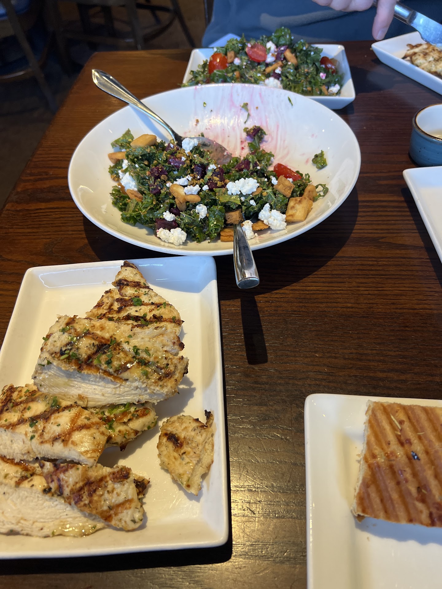 Read moreThis used to be our favourite place as a family with young kids up until 2-3 years ago. There was a server named Nadia at the park road location who was impeccable and you felt like you were at a high end place and their moussakka and bread were delicious. However, last night my friends and decided to have a girlsâ night out with our older kids (between 10-12) and it was a HUGE disappointment. Prices are high end but the service by Suzanne as well as the food were WAY below average. Our server was overwhelmed from the word go! I tried to make her life easier by asking her to take down each order (mom+kids) separately so there would be no confusion for her in the end with the separate checks. She looked at me like I had two heads or like I wasnât speaking English. I wanted the lasagne and asked if it had pork stating that I donât eat pork and she said yes it does and kept standing right in my bubble and I felt pushed to make a quick second choice so I quickly picked the chicken panini⌠this shouldâve been her cue to tell me it had prosciutto in it but she didnât and I didnât see it either. When the sandwich came out I told her I didnât realise it had prosciutto in a chicken panini and that I hadnât touched it and if she could please take it away⌠up until this point I was very kind but her snide remark â well it doesnât matter if you touched it or not itâs not like we can serve it to anyone else either nowâ. I donât know your new menu- but as a seasoned server if I tell you I donât eat something and then order something with âsomethingâ in it it should your cue to warn me. Anyway, the sandwich was replaced or brought back without prosciutto by the owner with a scowl. Needless to say I lost my appetite and left the restaurant eating nothing. We were a table of 8 so the tip was already built in and thatâs what was taken advantage of by the service⌠the waters werenât replaced until I asked her to, never once did she smile and not once did she come by to check on us and the food unless we tried to hail her down for something. Will definitely not be back and would 10/10...