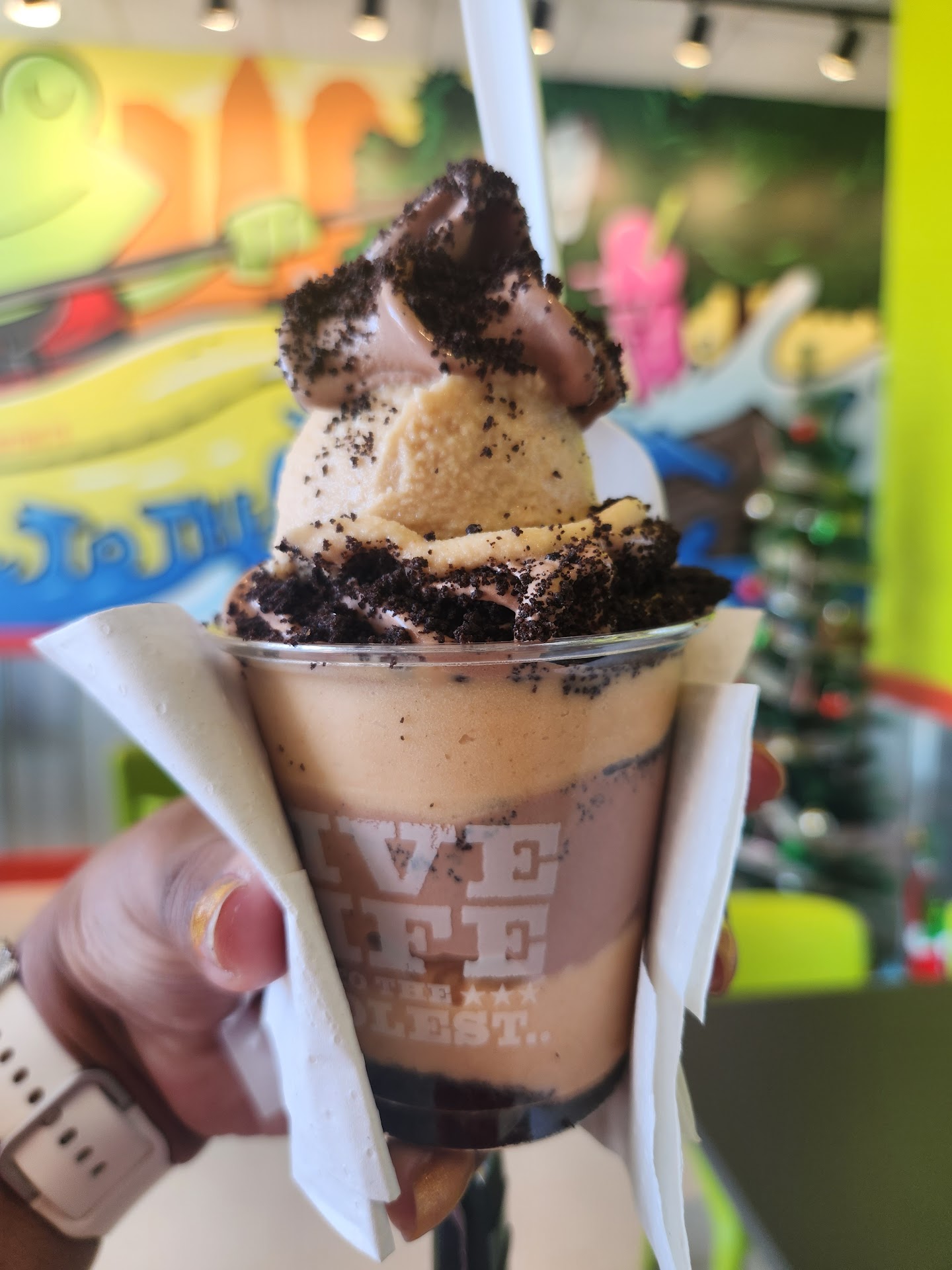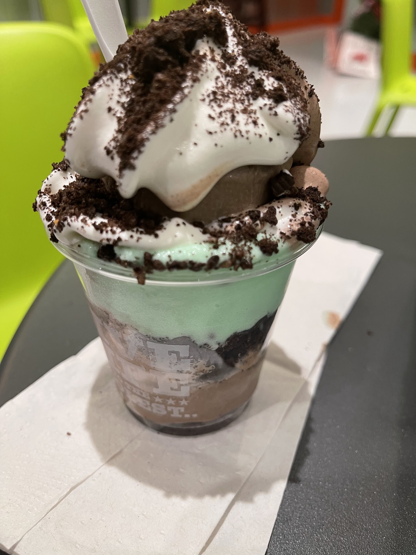 During both of my visits, the dessert was delicious but the associates filled the cup way too high. It is guaranteed to melt fast and make a mess in the store, outside, in your car, or wherever you eat it. The store’s tables and floors are scattered with cookie crumbs and chocolate chips due to the product overflowing. I bought two desserts on my second trip to bring one home for my husband and ended up throwing it away because it melted all over the store’s table in a few minutes. If you do visit, I would recommend asking for your dessert in a cup one size bigger than what you order.