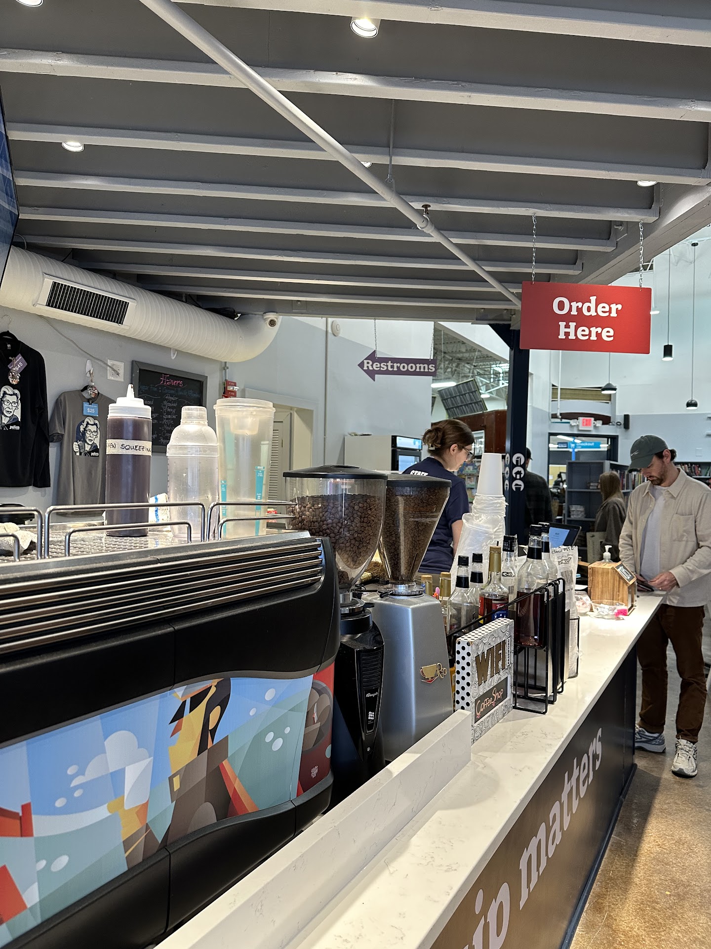 While they are separate businesses with separate checkout areas, however, they are really part of one big warehouse and customers can easily go in and out of the cafe and ReStore without going outside to exit one and enter the other. Because of that, I suspect that they are both run by Habitat for Humanity, and I’d also imagine the proceeds from both help the same cause.