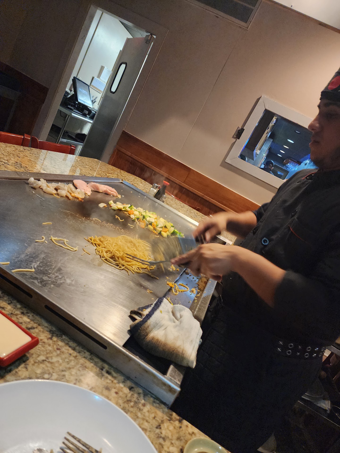 Was out looking for a quick eat. It had been 10 years since I have previously visited this location. 10 years ago was much better than currently. Let me give a breakdown of the events on Friday, 4/13. Upon arrival, the building all looked the same. The landscaping was ran down out front as well as a coiled up garden hose across the walkway. The foot path coming out of the restaurant was disgusting. There was dirt/grease caked up, several millimeters as you enter the door on the ground. The interior had not changed. The walls, floors, hood vents and grills were all dirty. The hood vent did not have a drip pan in the slot. It was covered up with a grease soaked kitchen towel. The grill we were at was turned way too hot and emitted a horrible burnt grease smell the entire time we sat waiting for our food. After salads and soups which were pretty good, the waitress kept coming back stating the chef would be right here. There were no other chefs on the floor at the time so a shortage was not an issue. After 45 minutes of sitting down, the chef arrived. This chef was honestly the best chef I've seen at a hibachi place. He was really good with his hands, had great tricks to keep entertained and had a great personality. He really was great however not clean at all. His uniform was filthy, he shows up to a new, fresh grill with the previous rag from his last table. I saw MANY cross contamination violations as we were eating. He would serve hot, cooked vegetables, noodles and rice just after flipping the raw chicken, seafood and steak then wiping it between his sandwiched rags. This happened throughout the meal. What did it for me was when we got to the point of where meat was done. The chef started serving far left. He served the other party a serving of shrimp. This person immediately let him know she did not order shrimp and did not want it. The chef picked it off her plate that she had been eating off of with the same grill spatula and fork and proceeded to put it on OUR PLATES!! After I let him know that was not cool, he requested more shrimp from the back. We couldn't eat more at this point. I was sickened. I went to the manager on duty. She blew off everything I stated to her what happened and she replied with the comment of "Oh yeah, all of our chefs do that, except the issue with getting served food from someone else's plate." What are these people doing in the back if they do not think twice about give you others food that was picked over right in front of the entire table? We quit eating after this mishap, notified management, left and will never, ever go back. Reading reviews it seems as if a good quality restaurant here is a thing of the past. Also, upon browsing here, some of the images (first 2 or 3) uploaded for 'this location' by owner is actually another location,...
