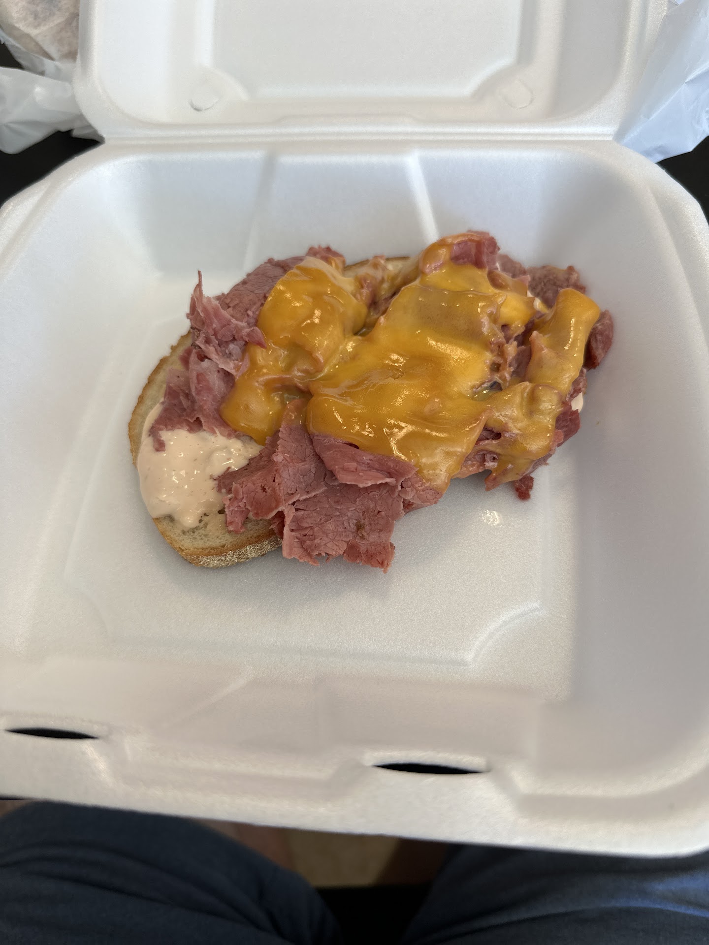 They still have their signature open-faced Reuben, and it's tasty enough, but everything else seems a little low-rent. In place of the ceramic plates, they have paper plates and styrofoam boxes. Gone are the table signs and the NYC based decor. There's no flatware-- just flimsy plastic forks and knives.