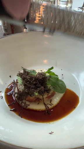 The chicken dish surprised me. A Poulet Rouge medallion wrapped in crispy skin, sitting on kohlrabi purée with black truffle jus. Chef Eric brought out a whole black truffle and shaved it tableside like it was nothing⊠but it was everything. The aroma hit instantly and tied the whole dish together. This is how you do chicken right.