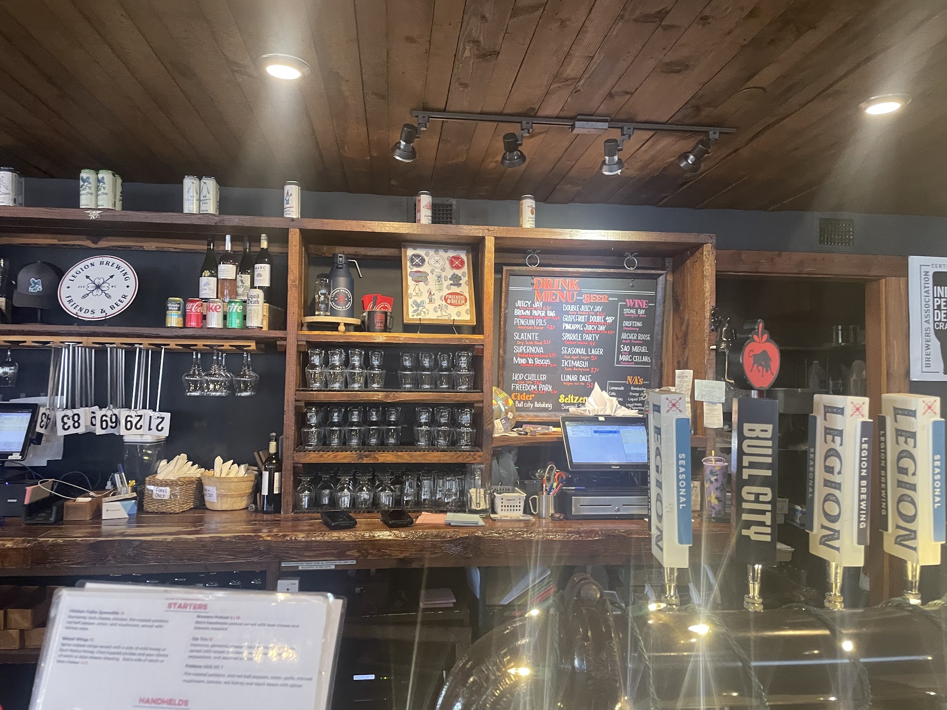 Legion Brewing has plenty of seating both insides and outside for the SOLO DOLO bar adventurers or for small to large groups, Legion can definitely accommodate. The outside seating consists of benches, built in concrete slabs which are accompanied by a wood-burning fire pit. Inside they have a u-shaped bar, high-top tables, in-wall benches, and stand alone tables. The bar is lined up with beer taps of their wonderfully delicious beer.