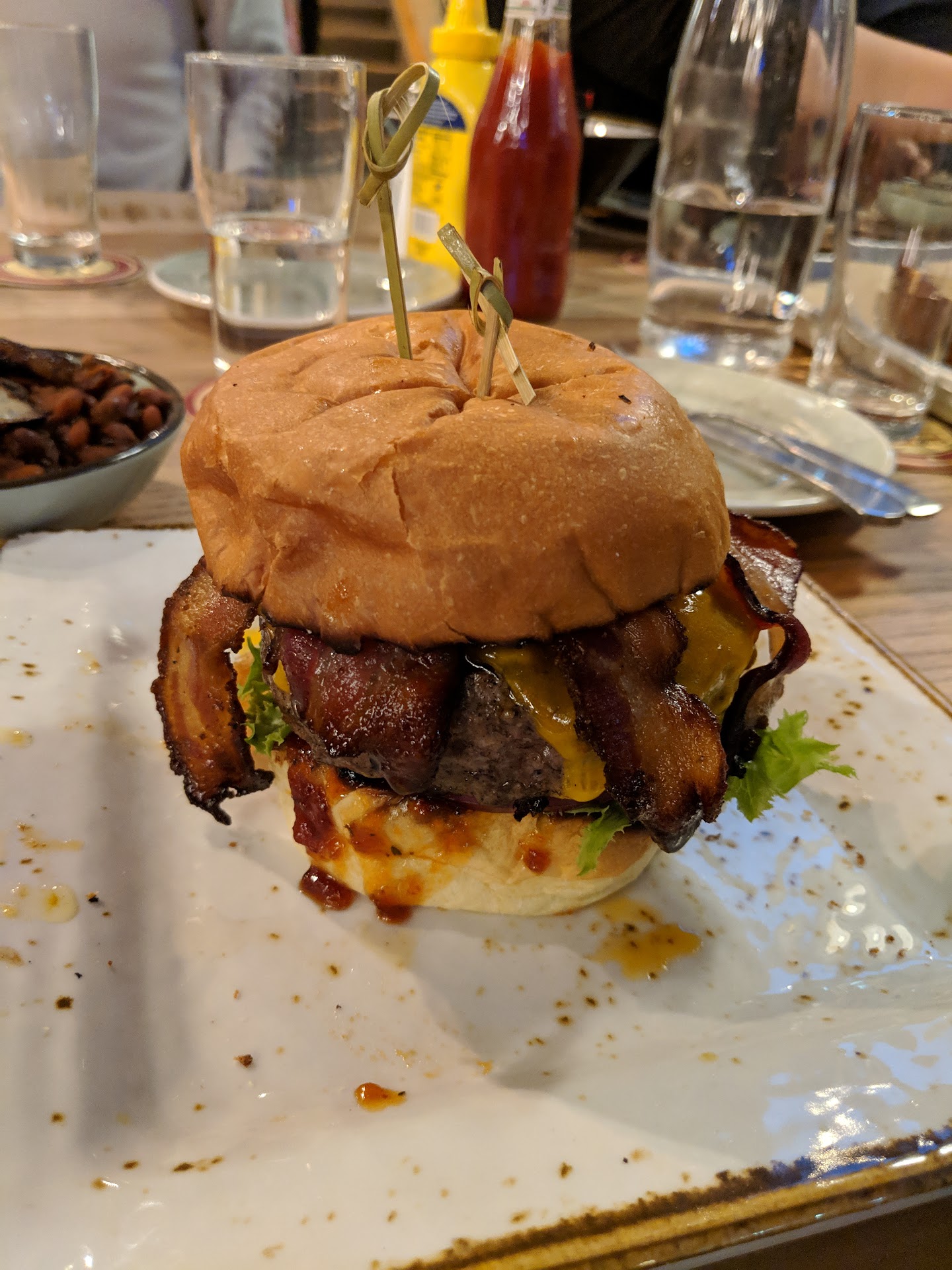 Once we were actually able to order, our food actually came pretty quickly. My husband and I got an order of the ham mac and cheese, the troop flatbread, and the half barrel burger with a side of the pork and beans. The mac and cheese was amazing and so was the burger. The flatbread was pretty good. I liked the bread, but it could have used a little more flavor. The pork and beans were gross and we didn't eat more than a bite.