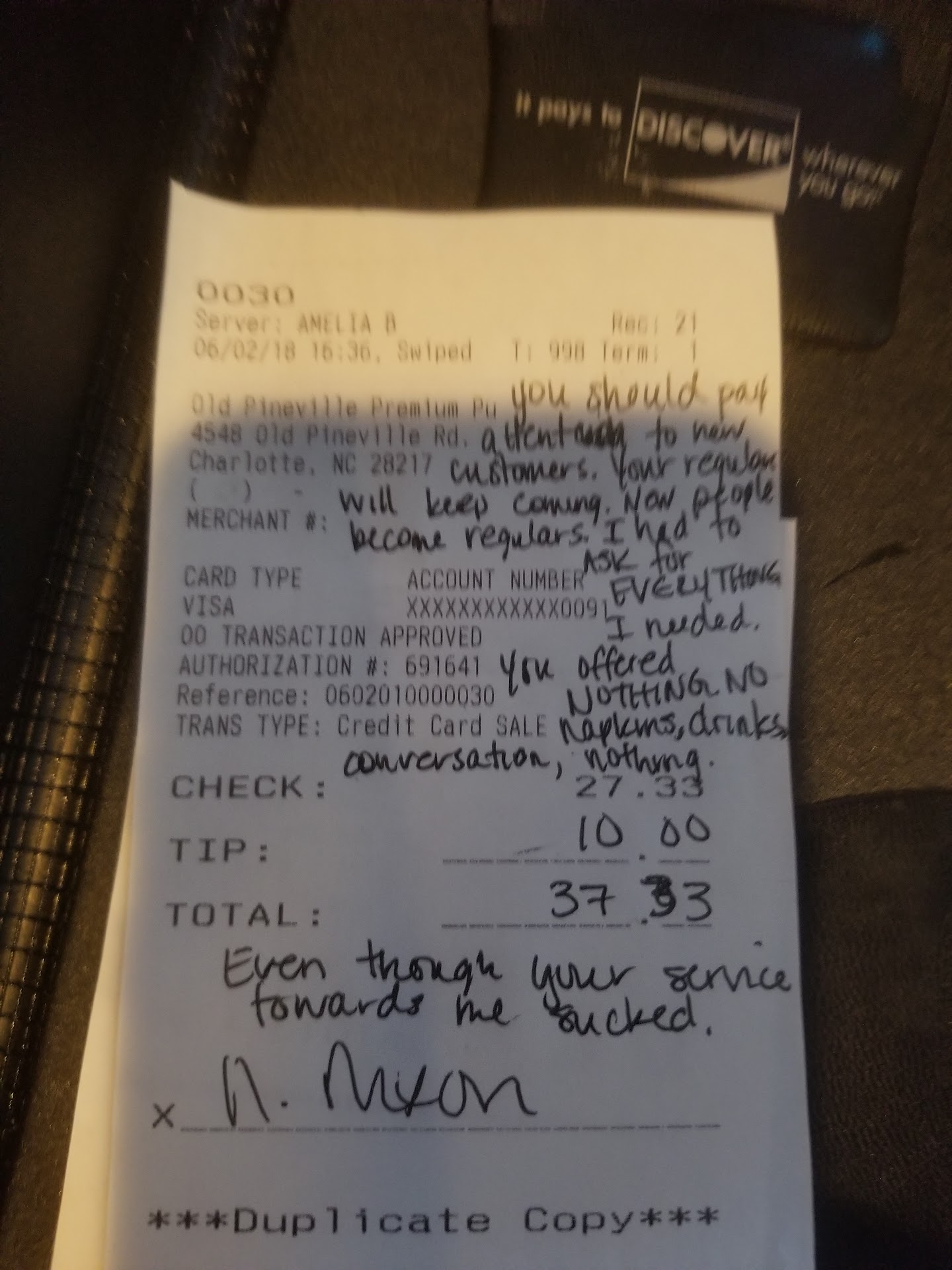 My problems came with service. Amelia B was my bartender. I'm not sure what the problem was because she was very energetic, conversational, and attentative to (what appeared to be) regular customers at the bar. This was my first time in this establishment. She offered me NOTHING. Not even a menu. I had to ask for everything I needed and wanted. When my glass was empty, she did not offer another drink, I had to ask for it, even though, I heard her offer other people 2nd, 3rd and 4th drinks. I put money in the jukebox and tried to break the ice by asking her what kind of music she likes, that didn't work. Still no conversation from her, she went right back her regulars, as if I was not a paying customer. I ate my entire meal with no napkins. I decided against asking for any because I felt like I was a bother at this point. I even had to tell her to take my card, because it did not appear that she was going to come cash me out after she brought my check (that I had to ask for). No dessert was offered, she never asked how was my food, did I need more dressing, was my salmon cooked well enough. NOTHING. Lastly, when she dropped my card back off to me, of course, she did not invite me back. Very poor service.