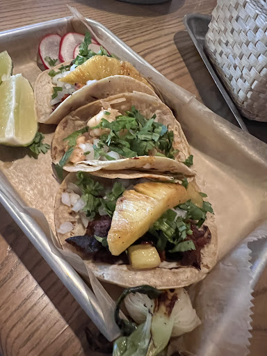 On a brighter note, the food was quite enjoyable. The meal started with complimentary fresh tortilla chips served with three different salsas: a spicy peanut one, salsa verde, and salsa rojo—all delightful. The corn tortillas are made in-house, adding a nice touch. The albondigas, a special promoted on their Instagram, were three generously sized meatballs in a pleasantly spicy red sauce. The flavors and textures were spot on. The taco de trompo was tasty, topped with pineapple, chopped white onion, and slivers of watermelon radish. Some might find the meat a bit salty, but a squeeze of lime could balance it out. However, the $5 price tag for a single taco was a bit steep, even for Charlotte.