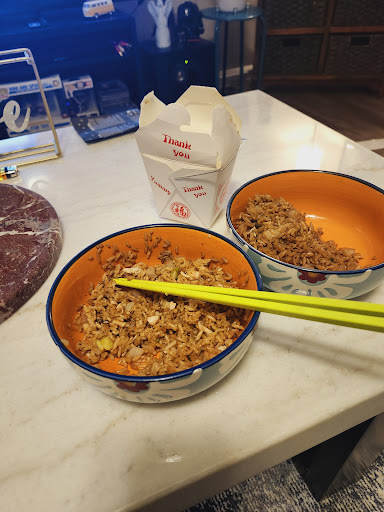 So I started a little bit around the time they're cleaning the stove or the area. Fried rice, with chicken. Simple quick.