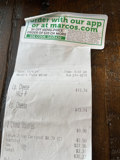 I suspect that the employees are tricking the computer system for false metrics, and hiding the incorrect order times. I would have been fine if the order estimate said 45 minutes to pickup so that I could plan accordingly, instead of being misled and wasting my time waiting in the store. I will think twice before ordering from Marcos again until the timing can...