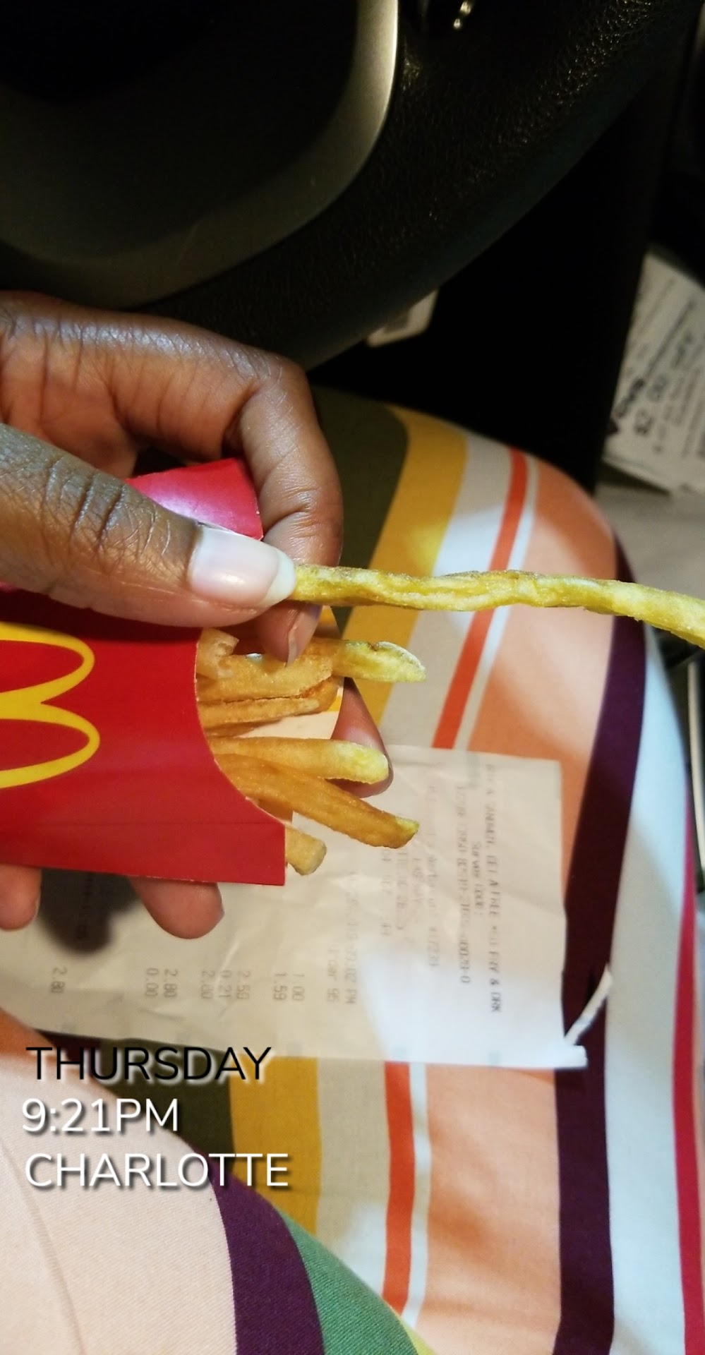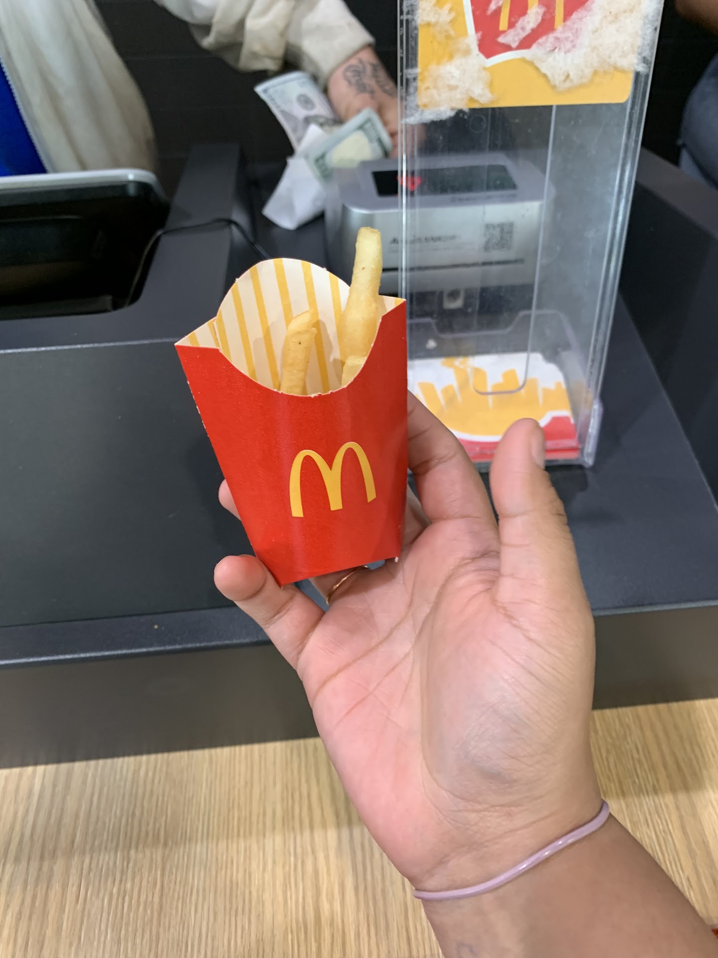 The picture below shows the 3 single fries my sister got in her happy meal. Some people were even missing toys & fries from a HAPPY MEAL like just how? Ridiculous somebody shut this McDonald’s...